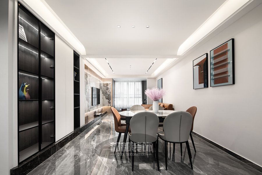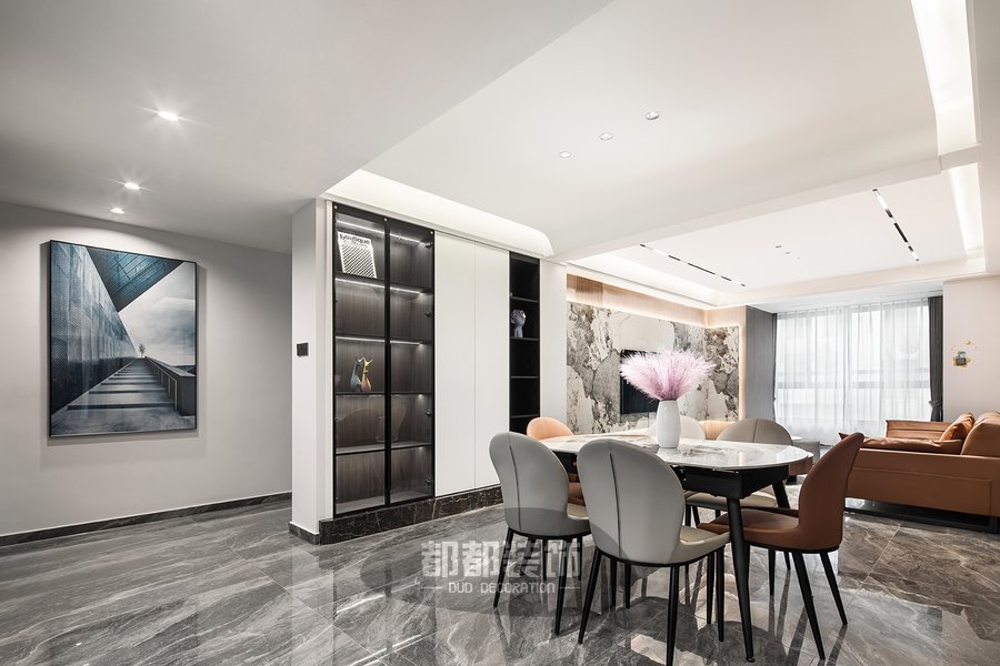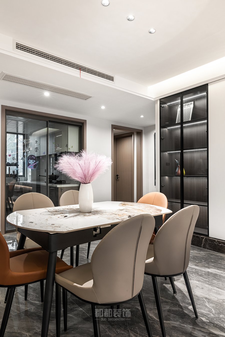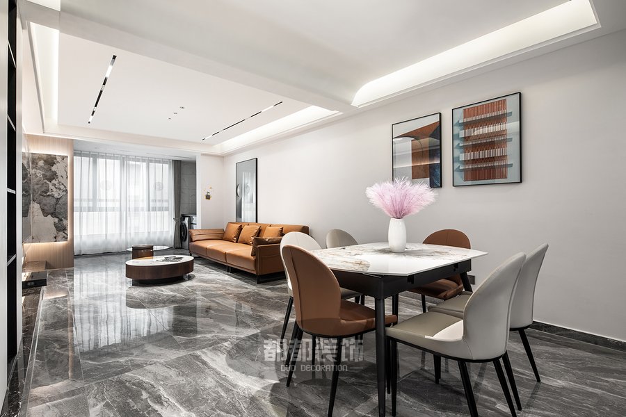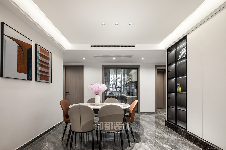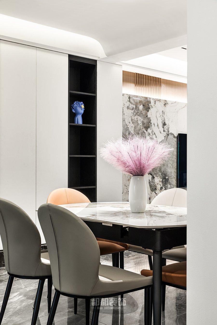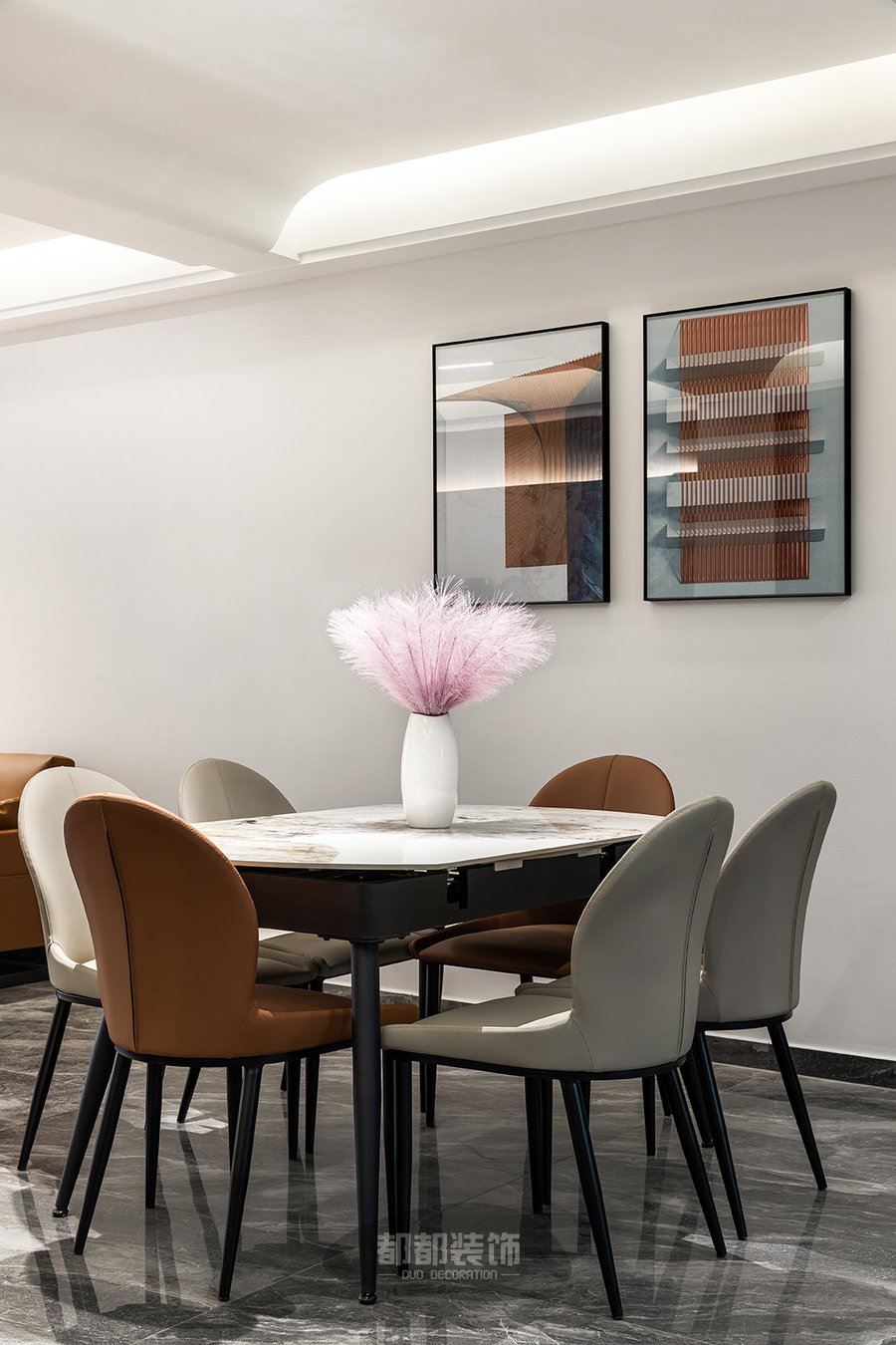 餐厅上方筒灯以灵活的灯光打造出温馨的空间氛围,白色大理石餐桌+棕白色软皮餐椅和客厅的配色很搭,优雅的气质应运而生,轻便灵巧的家具和亮敞的光线让空间自由而通透。