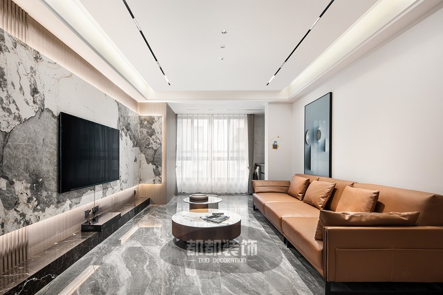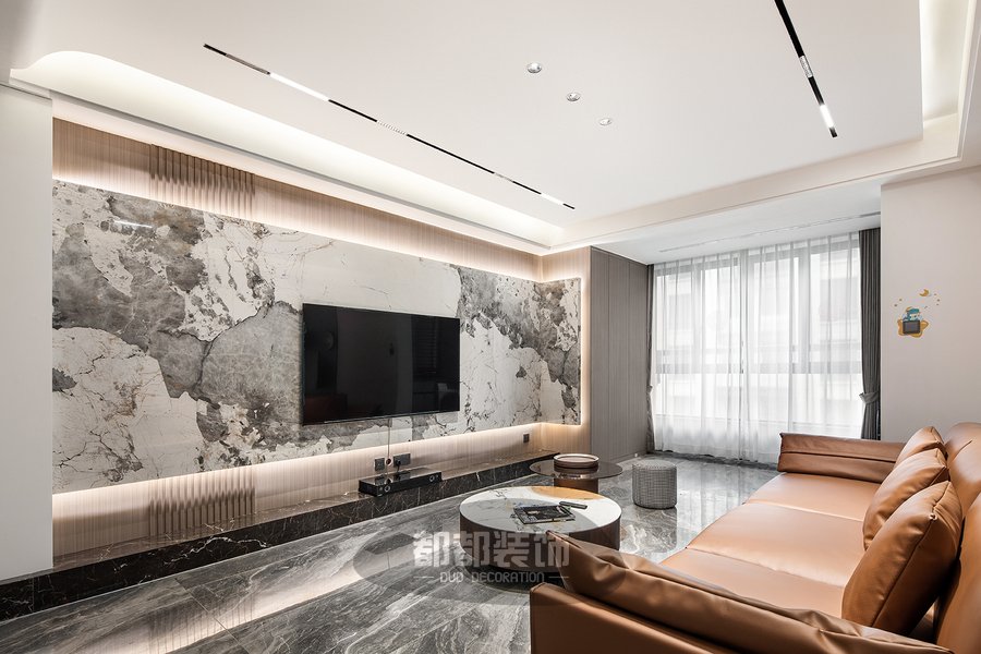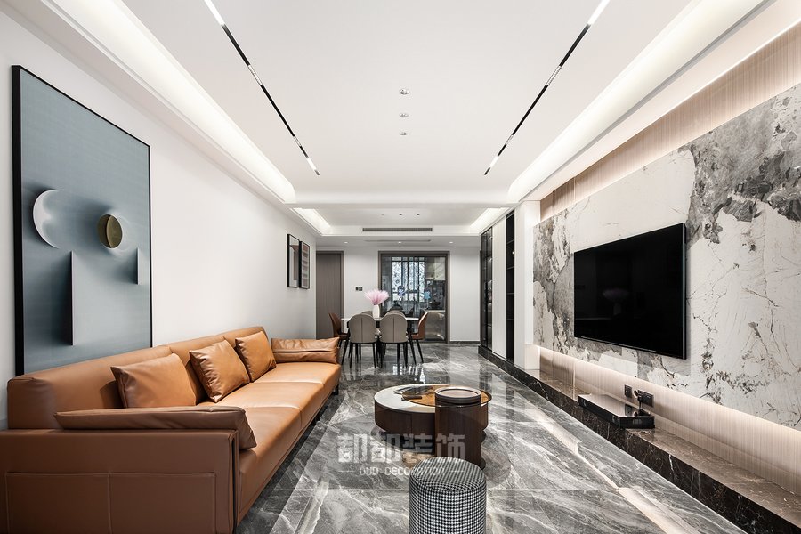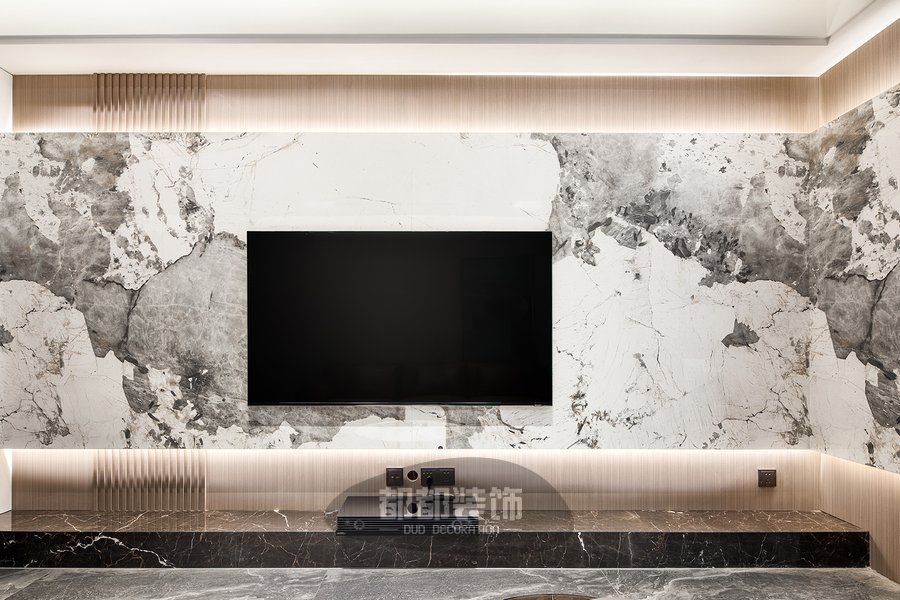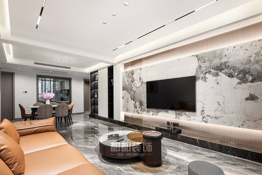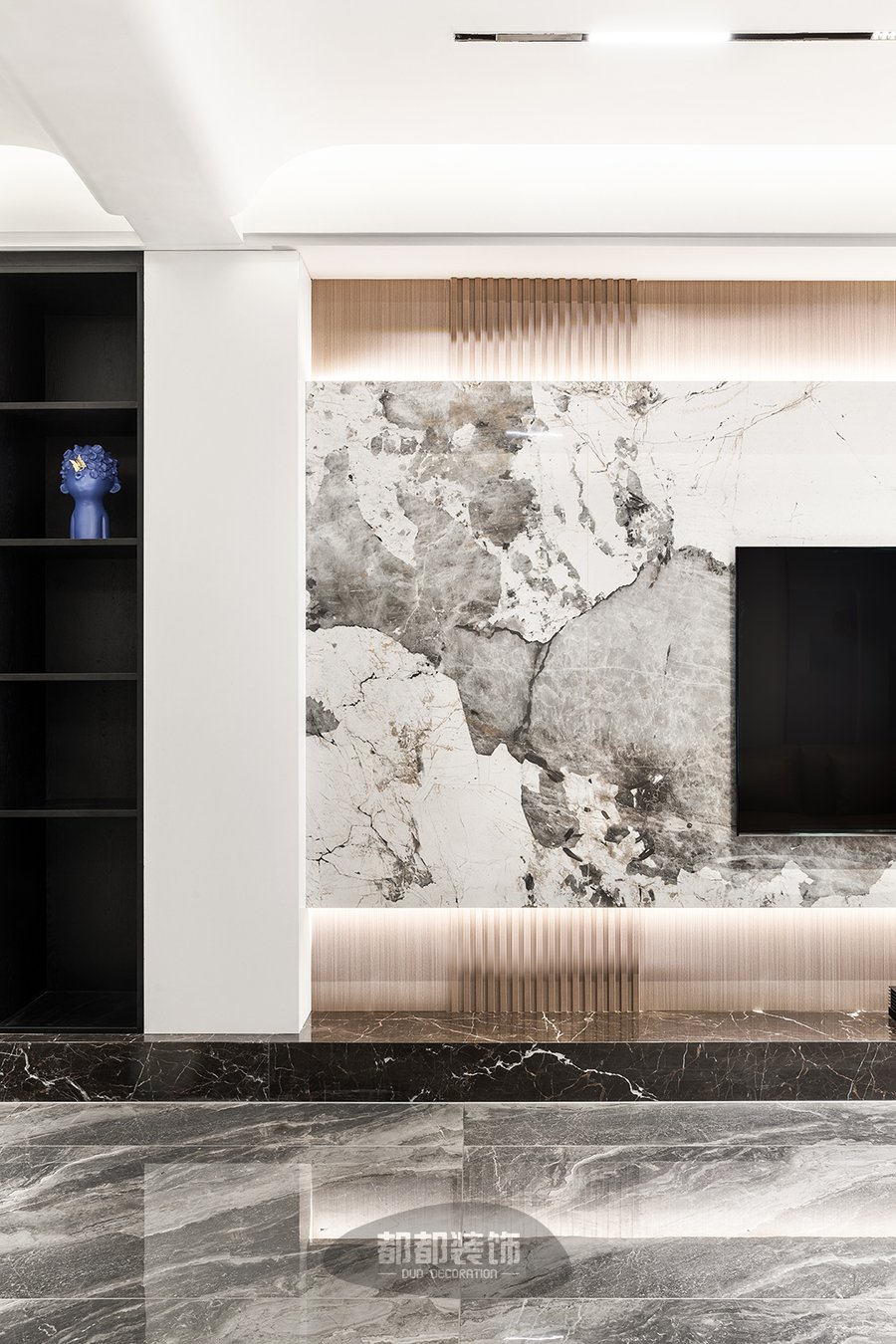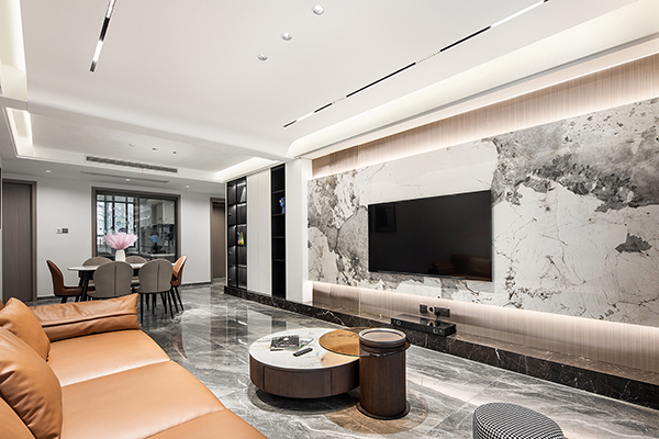 电视背景墙以潘多拉岩板为主,晶玉化的材质,复刻了天然石材的神韵,细腻的纹路如波涛汹涌般独具魅力,超长范围让客厅自带放大效果,岩板后面是立体精致的咖色格栅作为装饰,低调中不失质感,内嵌灯带的设计令空间通透而明亮,减少压抑感和拥挤感。