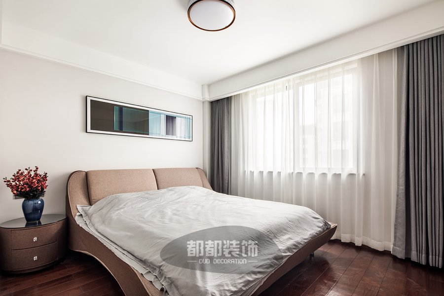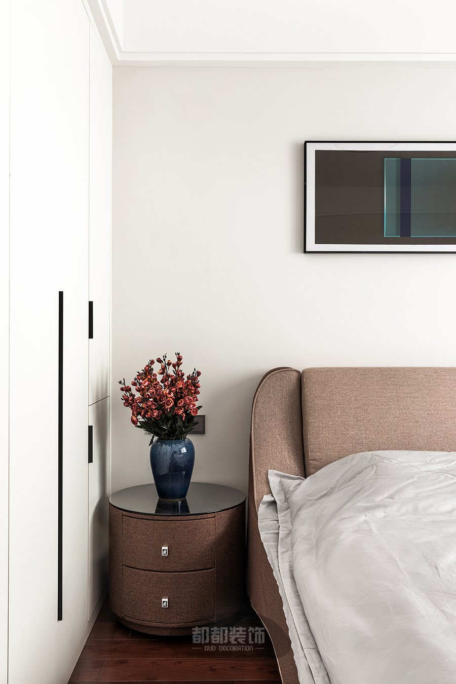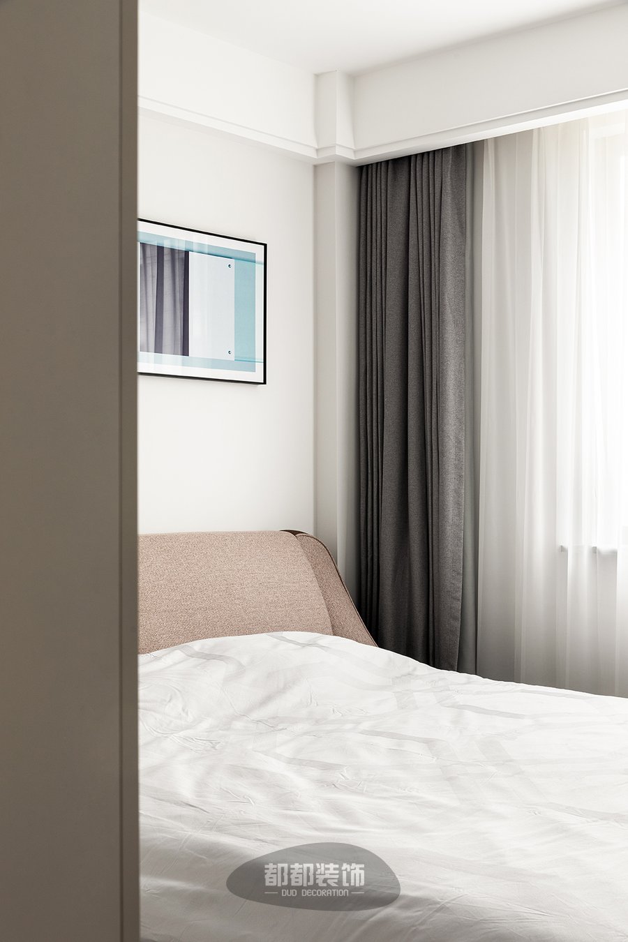 夫妻俩喜欢纯净的白、喜欢轻奢的质感、喜欢现代的简约……于是卧室设计走向也是结合了他们的喜爱延续柔和温馨的风格,白色软装床品与窗帘形成色彩统一,加以床头板温柔的米色、装饰画冷调的蓝色,一同增添灵动感。