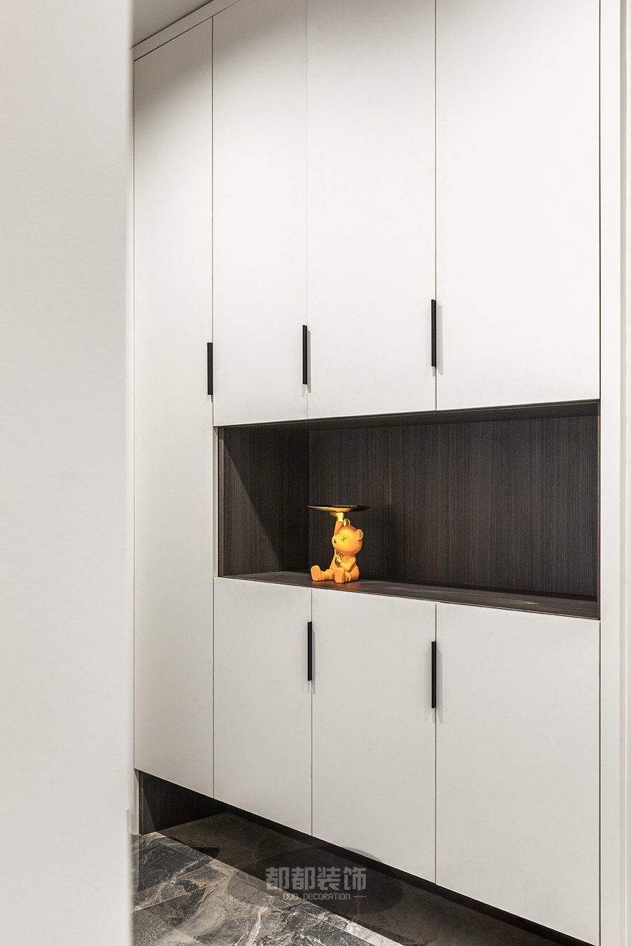 进入屋内,简约的黑白玄关柜映入眼帘,让归家的宁静和安逸扑面而来,顶天立地的鞋柜,强大的储物空间,把家里所有的鞋子都藏起来,镂空区域放置了一个小熊托盘收纳,丰富了空间色彩,氛围也变得更加温馨。