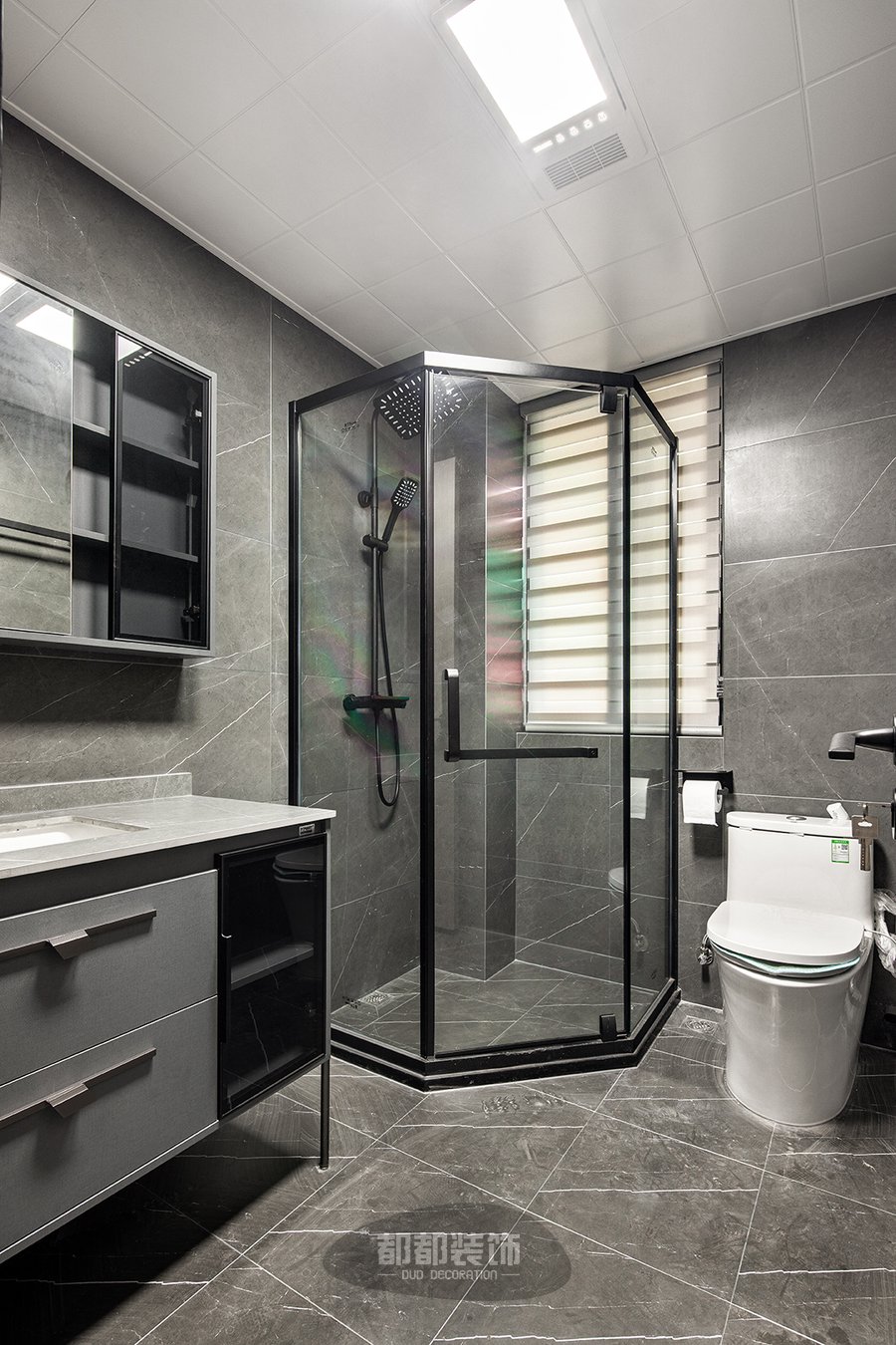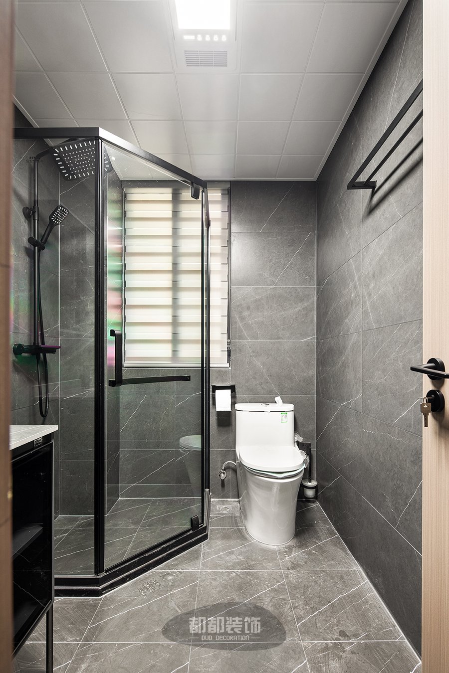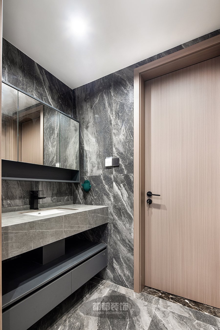 卫生间没有过多的装饰,灰色瓷砖搭配白色马桶,轻松就能拥有一个沉浸式卫浴氛围,灰白系的盥洗室大气沉稳,右侧特地做开放格收纳常用洗漱用品,方形化妆镜配合筒灯,让实用与美观并存。