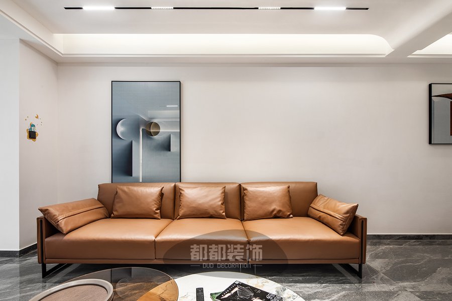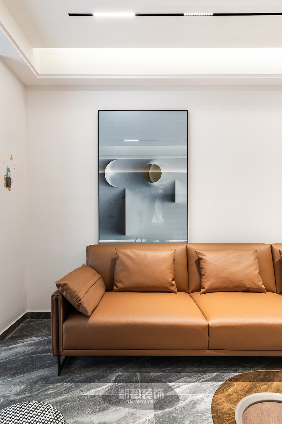 靠墙处摆上一套姜黄色的皮质沙发,暖色调自带沉稳气质,表面光滑的触感收敛外界的浮躁和烦乱的思绪,给予屋主包裹感和安定的情绪,让人可以长时间待在这样的空间里,身后是蓝色调的装饰画,冷暖色给人以宁静雅致的舒适氛围。