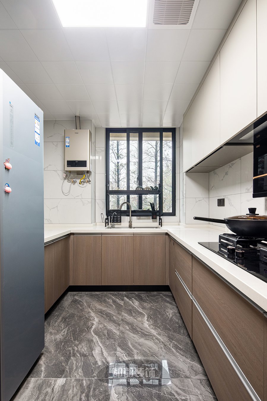 屋主厨房采用的是经典的U型布局,烹饪区一字型的吊柜靠着厨房墙壁一侧摆放,留空一侧的空间就不会那么拥挤,转角的小短边设置洗菜盆和地柜,还可以多出来一小部分储物空间,内嵌式冰箱不仅可以保护电器本身,同时还能节省空间,使用起来更加方便。