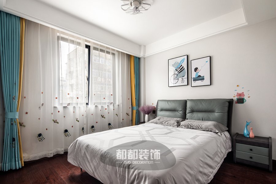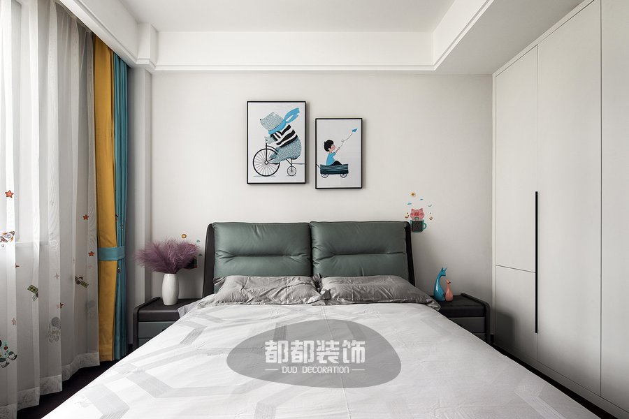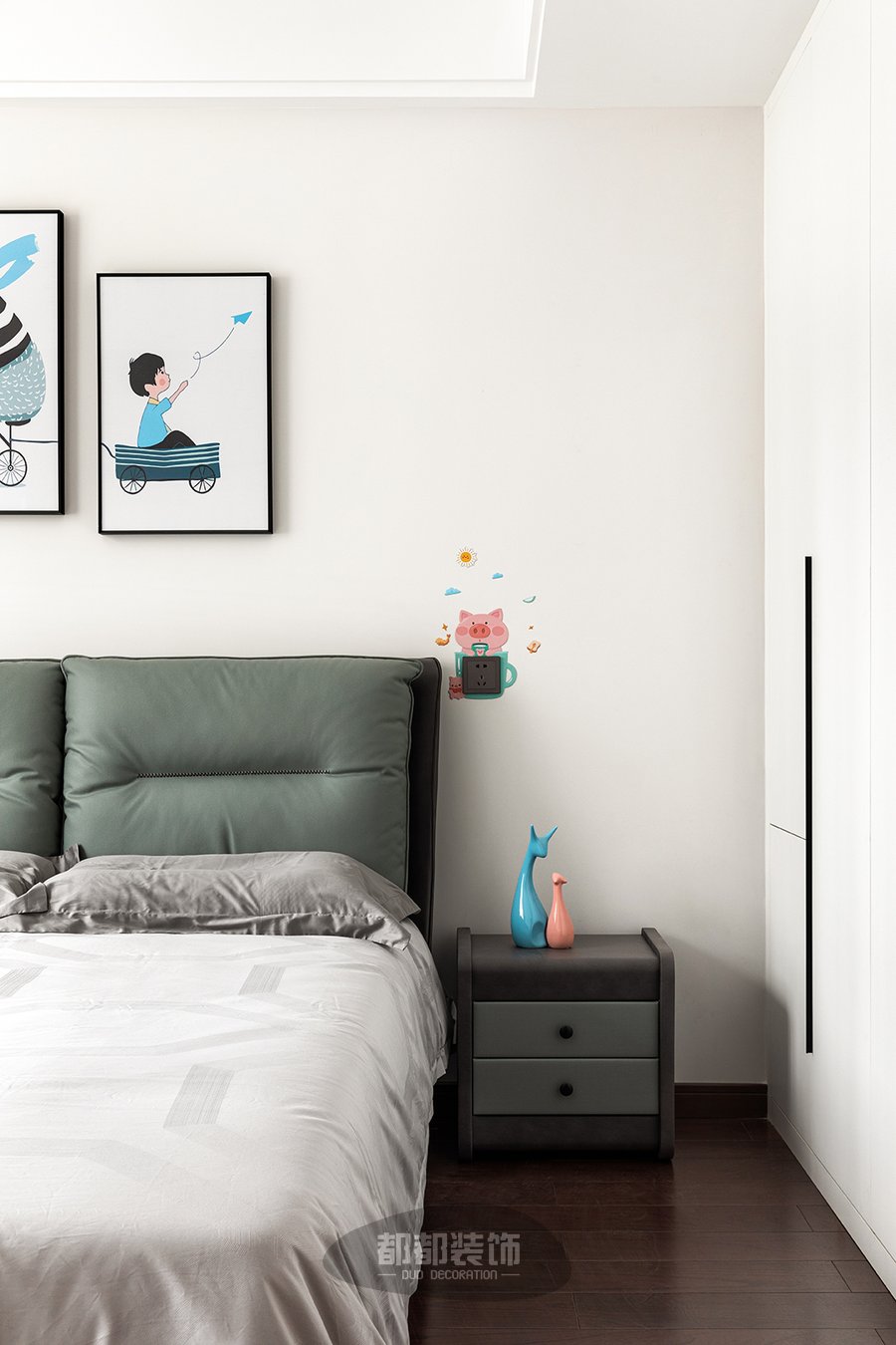 次卧入户视野直达床的中心,两侧床头柜简约的造型为睡眠空间增添一丝优雅,也满足床边置物的基本需求,大白墙搭配童真童趣的装饰画,暗绿色床头板增添家中空间色彩。