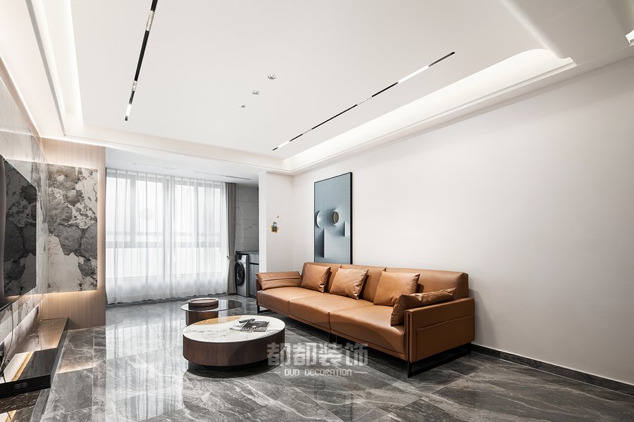 客厅顶面的磁吸轨道灯将视觉延伸进,屋内更显明净,客厅一侧的窗户安装了白纱窗,营造出柔和耐看的光线效果,既能保障室内的采光,又保证了空间的私密性,给整屋带来独特优雅的格调感。
