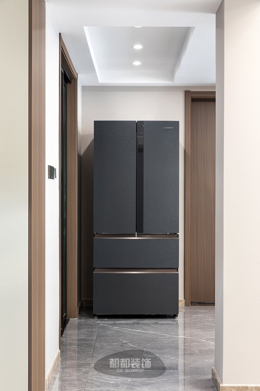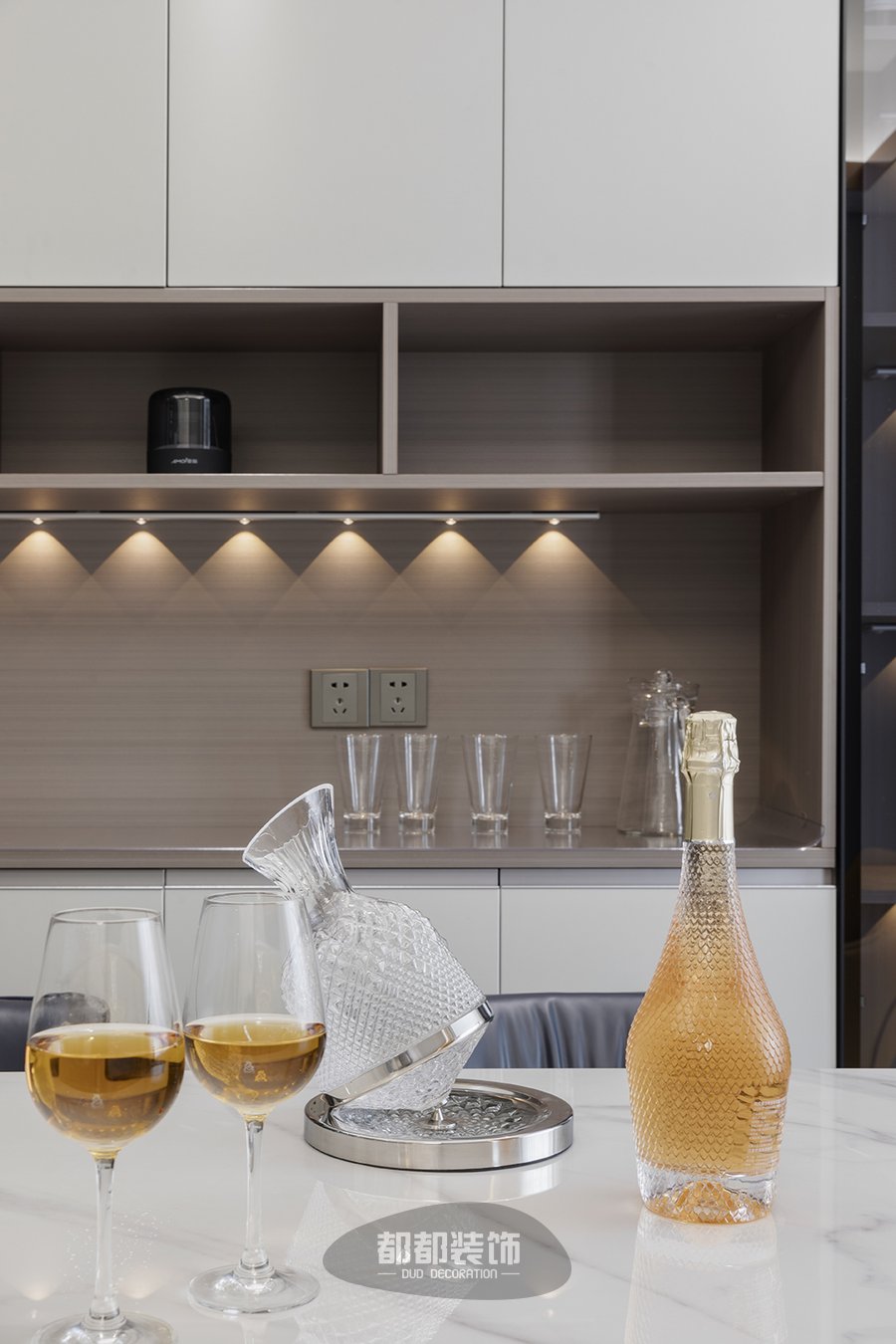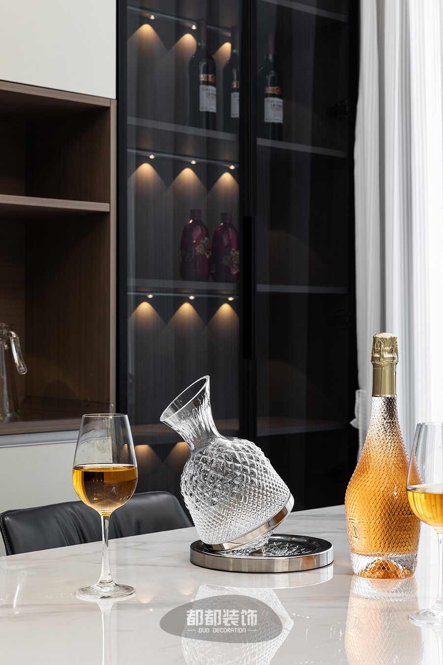 餐厅后面特意做了一整墙的展示柜和餐边柜,白色柜面恰到好处的留白,温暖灯带搭配随着光影若隐若现的朦胧黑色玻璃,呈现出一派简约的摩登情调,干净整洁又不失雅致。