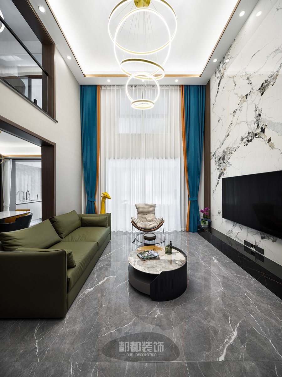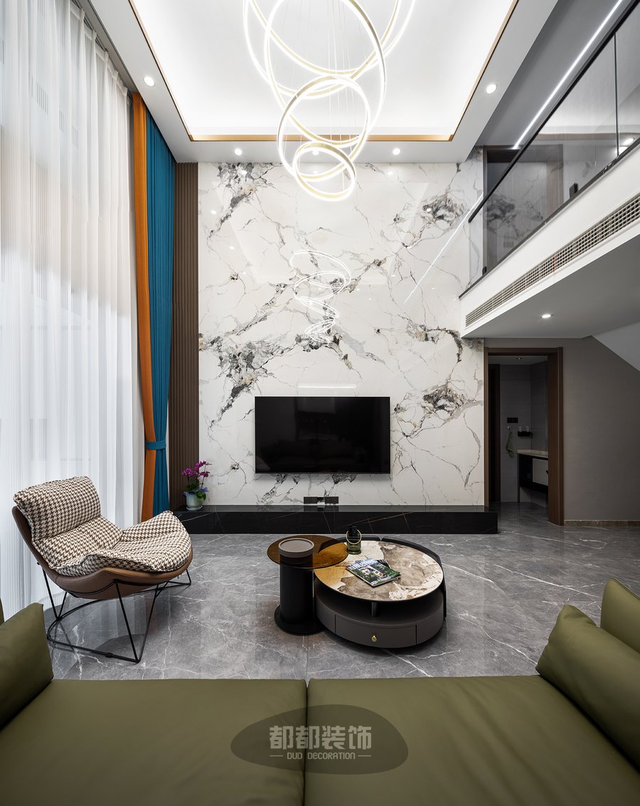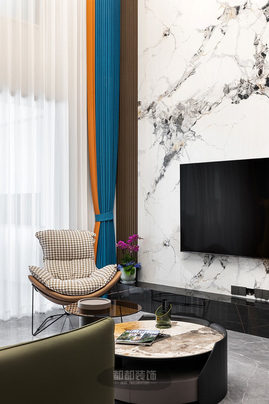 电视背景墙通过色调柔润的咖色木格栅,来调和整面大理石墙的坚硬质感,3500k色温的曲线灯带让空间有了温度,再加以橙蓝颜色的窗帘点亮空间,使空间更加活泼灵动。