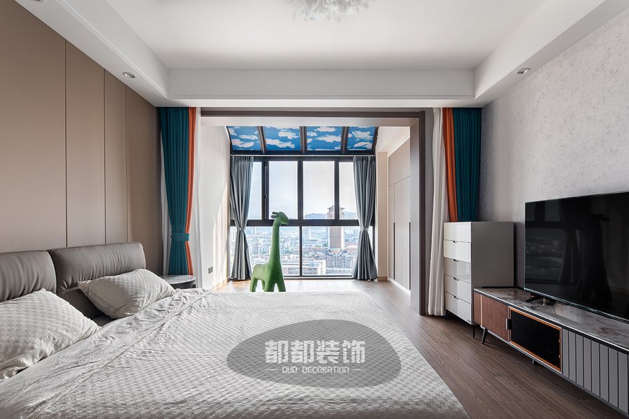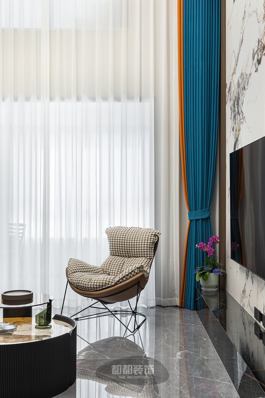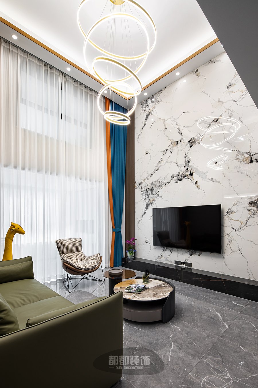 电视背景墙通过色调柔润的咖色木格栅,来调和整面大理石墙的坚硬质感,3500k色温的曲线灯带让空间有了温度,再加以橙蓝颜色的窗帘点亮空间,使空间更加活泼灵动。