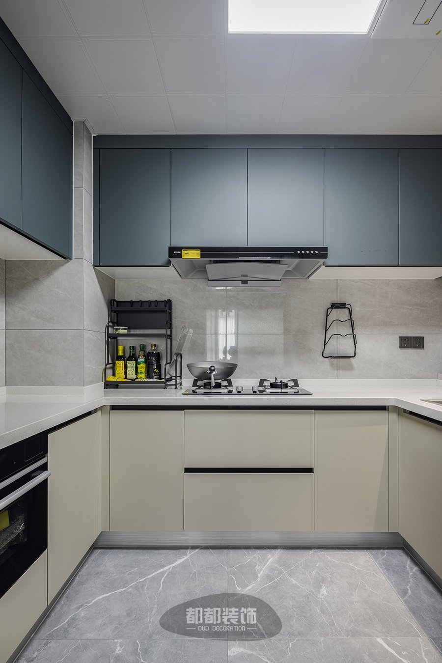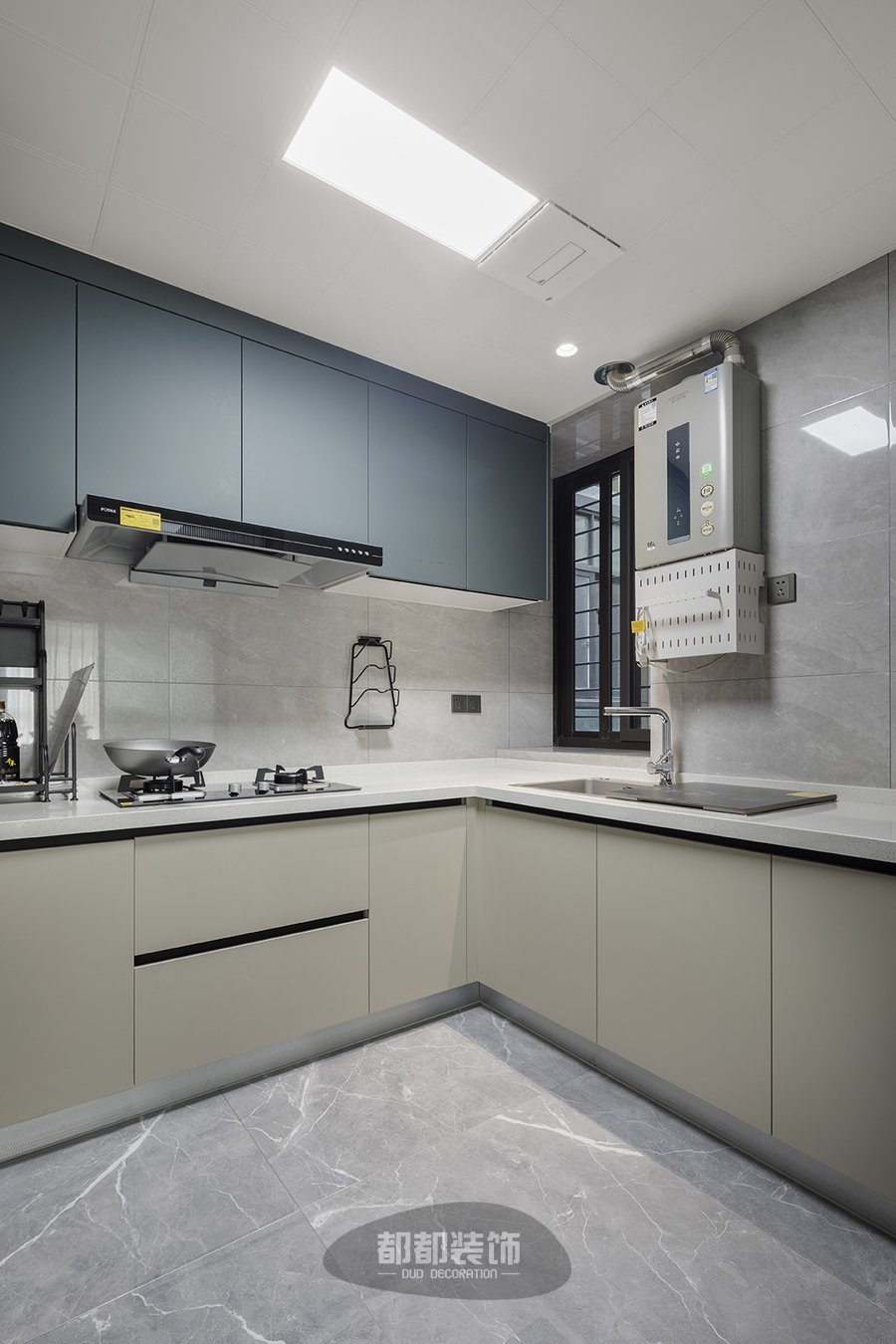 将原来的厨房空间外扩,形成U型布局的厨房,侧边窗户和方形灯具让采光性极佳,放眼放去整体布局紧凑有序,采用上下双层柜体增强收纳空间,白色系的橱柜显得轻盈而整洁,把冰箱放在厨房外侧,这让厨房的每一寸面积都得到了合理利用。