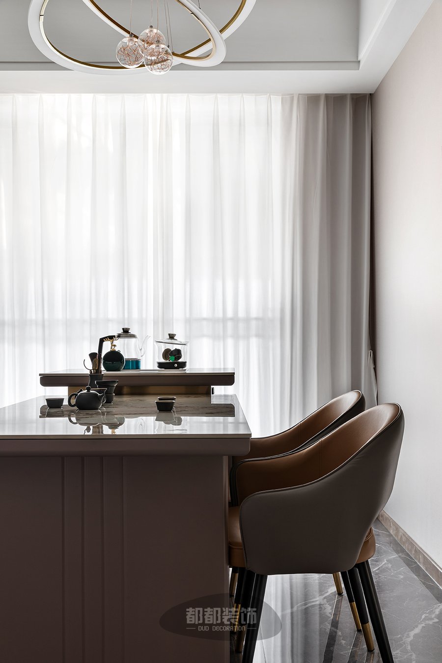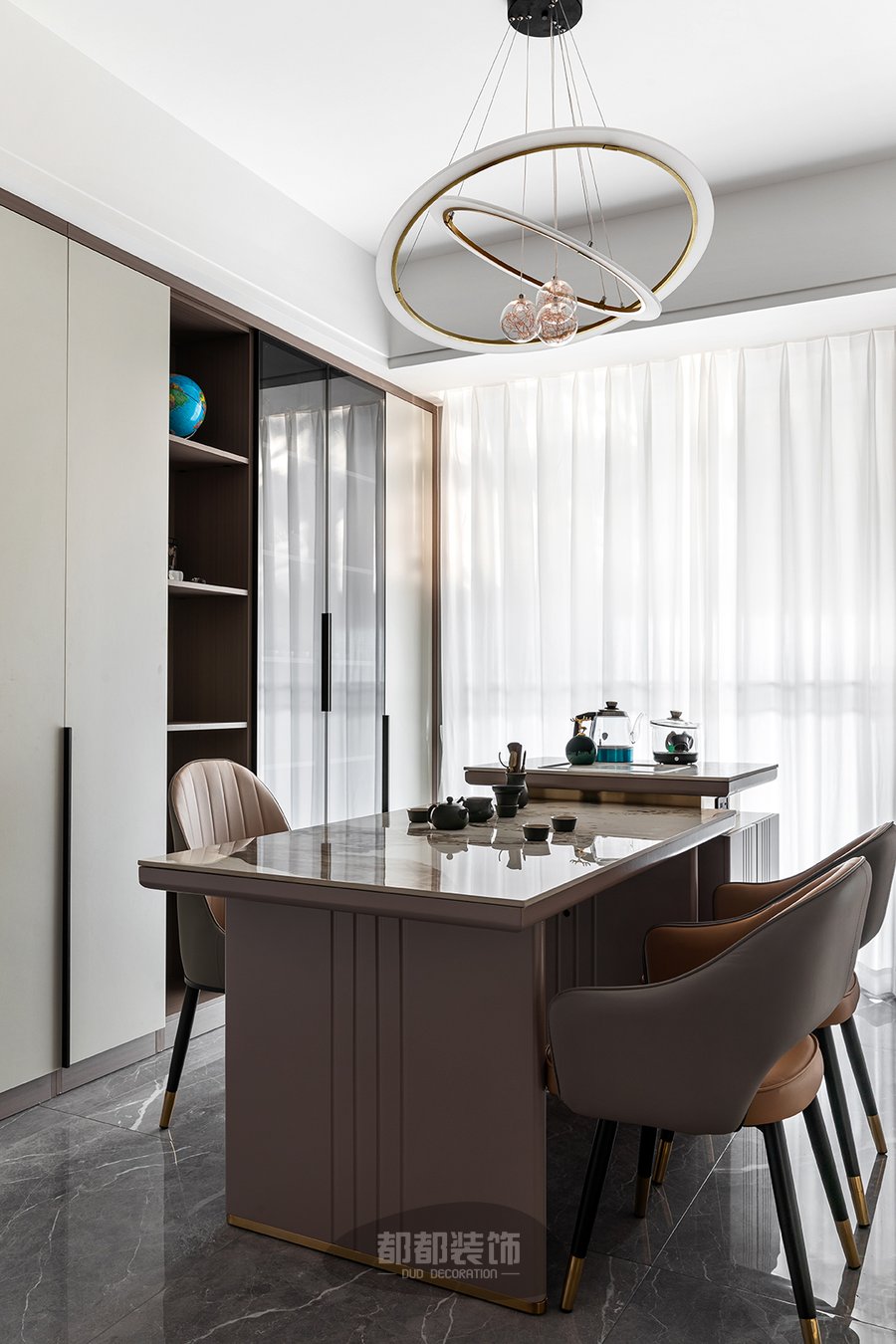 业主将喝茶文化融入日常,打造了一处两面采光的茶室,茶室整体依旧为现代风格,大理石桌面保留自然纹路,提供平整光滑的触感,靠墙定制收纳柜放置茶具用品等,美观精致;热水滚烫,茶叶翻滚,杯声轻碰,坐拥古雅,亲友谈天说地,偷得浮生半日闲。