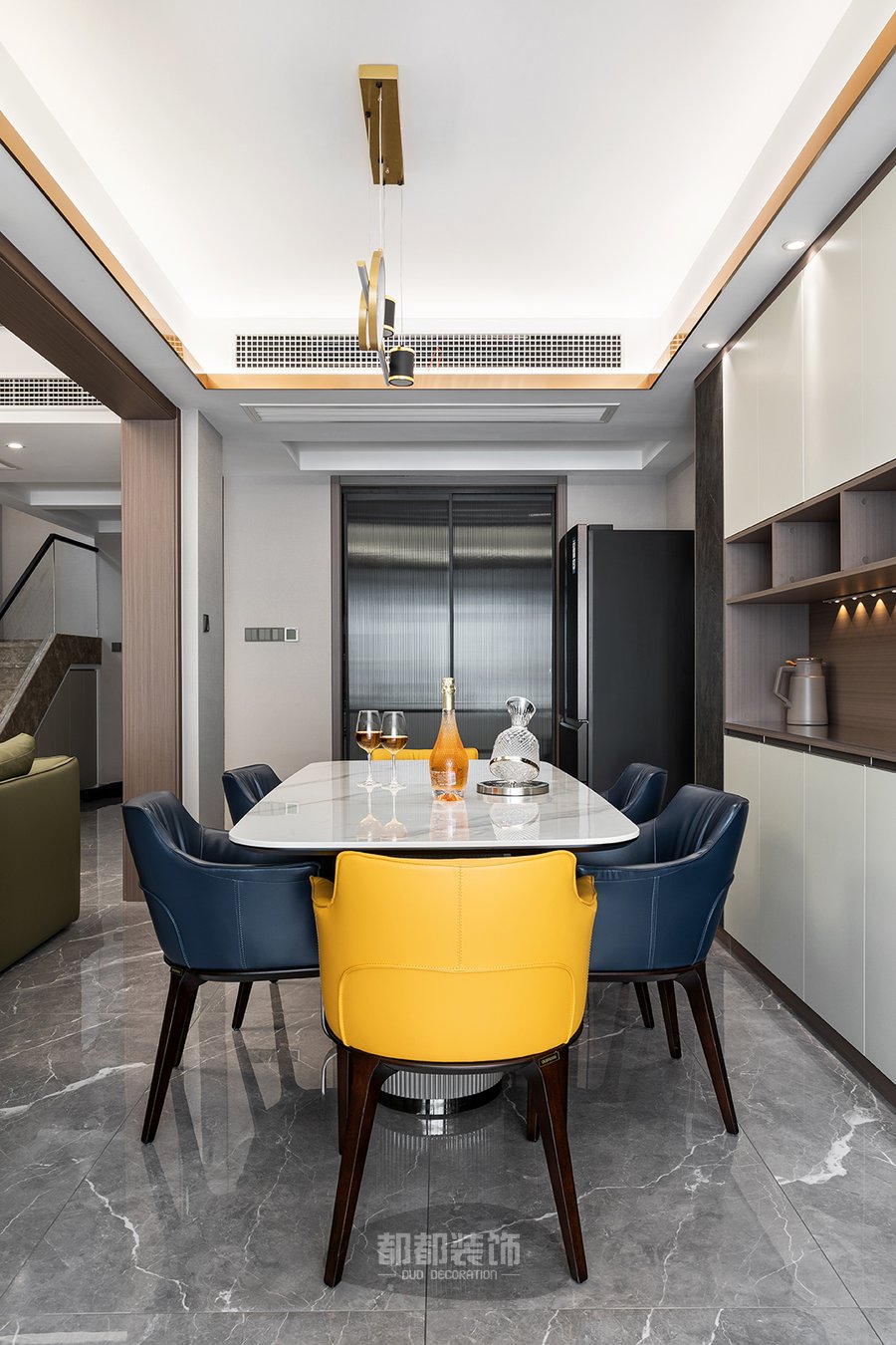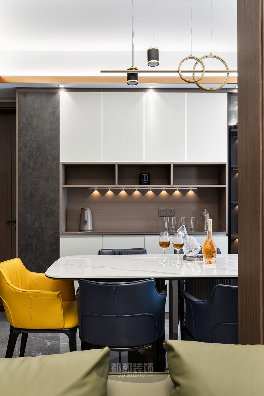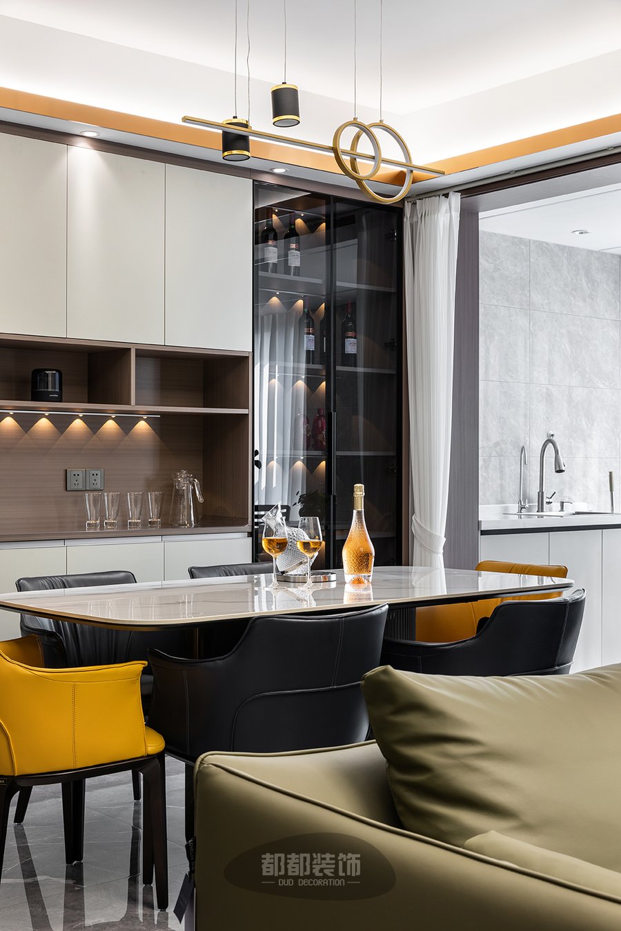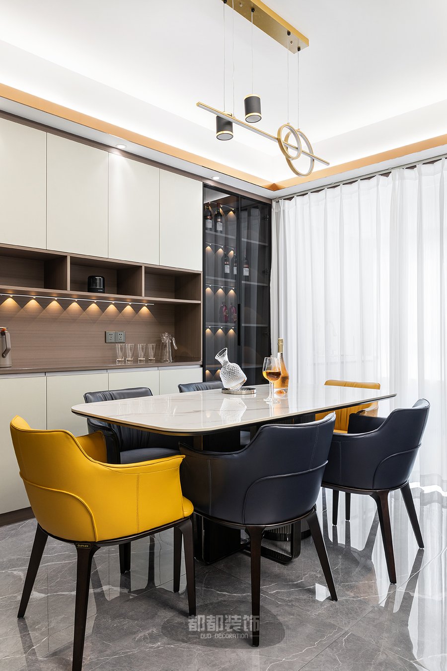 餐厅的主家具也都充满了现代轻奢的风韵,大理石台面与设计感十足的桌腿交相辉映,相得益彰,软皮的餐椅温馨优雅,而跳跃的亮黄色则为整个空间增添了些许层次感与浪漫情调,是趣味的碰撞与流动。
