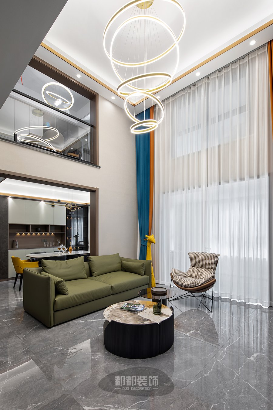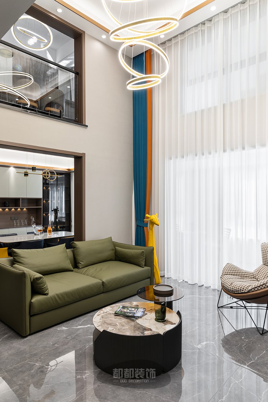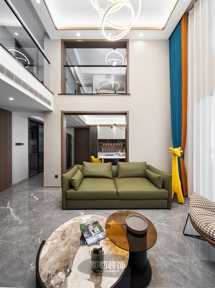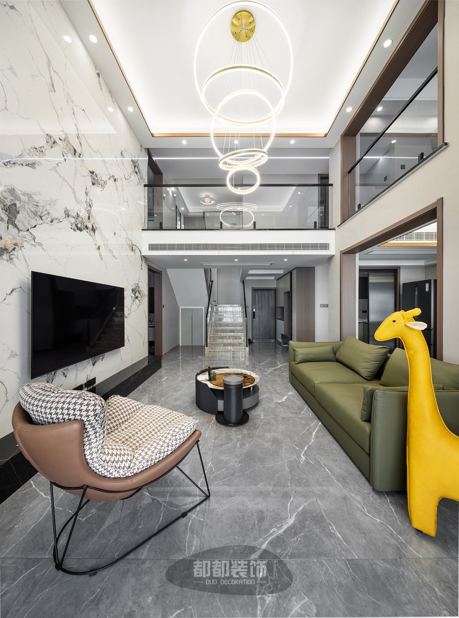 这么豪气的跃层大宅怎么能少的了艺术吊灯呢!时尚摩登的螺旋灯带在客厅中央熠熠生辉,从挑空的天花上垂下,仿佛梦回童话故事中华丽的古堡。