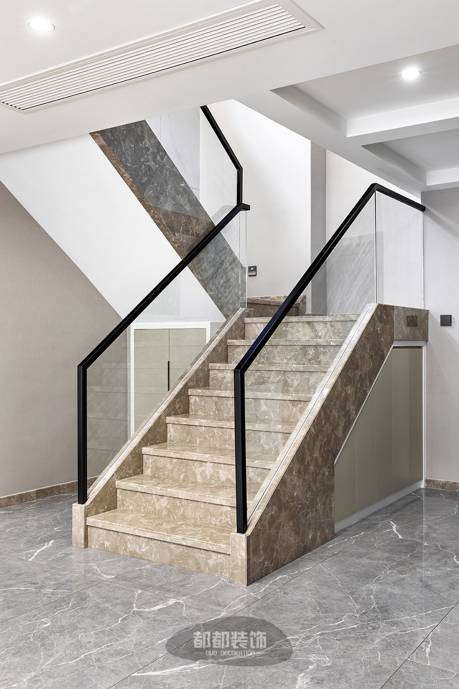 对于家里是跃层户型的屋主来说,楼梯处空间是一定不能浪费的,楼梯下方的空间用来做储物室收纳,可以来摆放一些鞋子、零碎杂物等,轻松多出5个平方的空间,玻璃面扶手增加通透感,浅咖大理石台面给人一种步步生莲的美感。