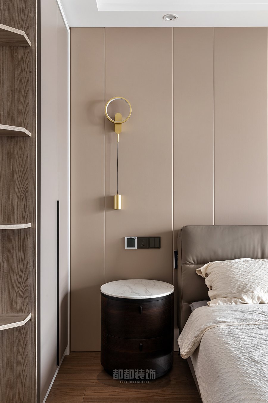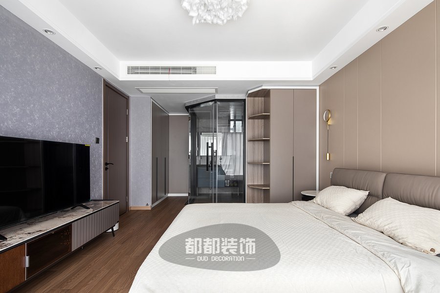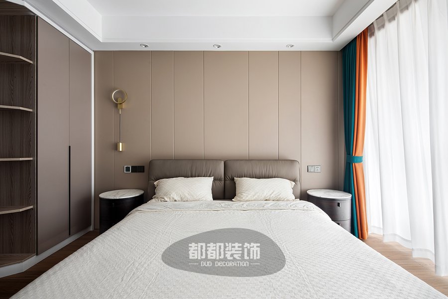 主卧作为使用时间最久的场所,舒适度尤为主要,背景墙采用木质护墙,搭配双眼皮顶面设计与羽毛灯的结合,素雅的白色使得空间更具质感,落地窗给室内空间带来足够的自然采光,还提高了卧室的休闲性质。