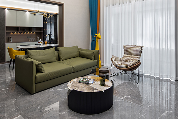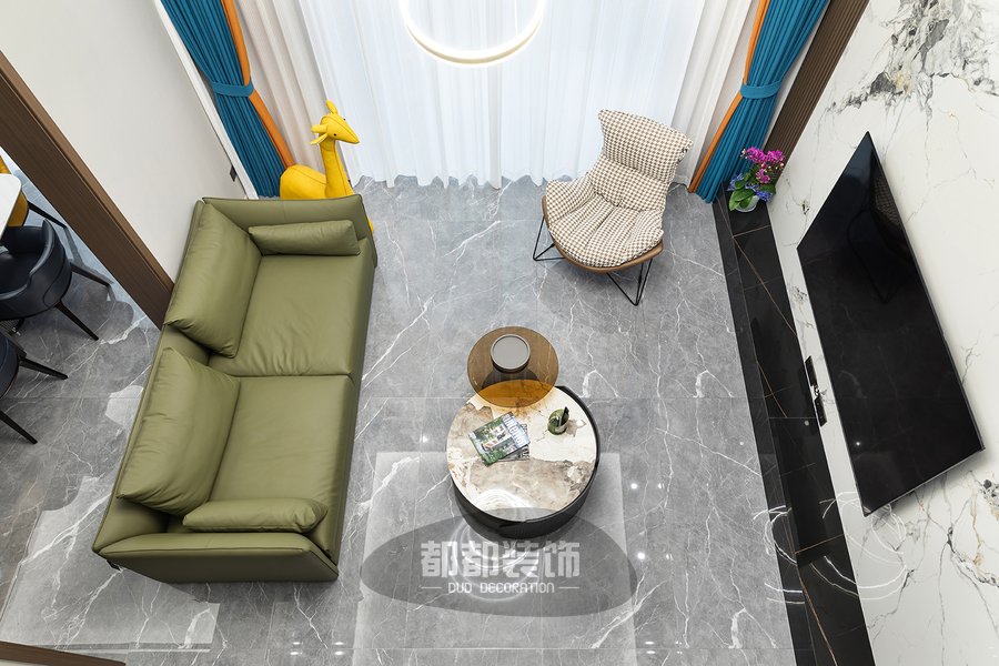 软装的布置上富有生活气息,暗绿色亮面质感的沙发线条流畅,弧形懒人沙发柔软舒适,搭配大理石组合茶几,整体简练时尚的同时也不失浪漫典雅。