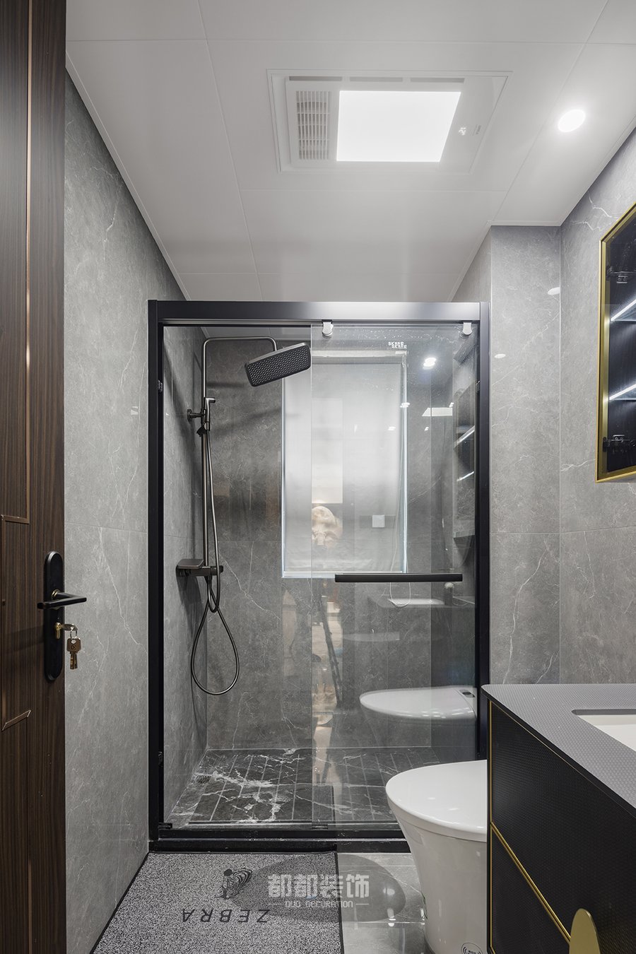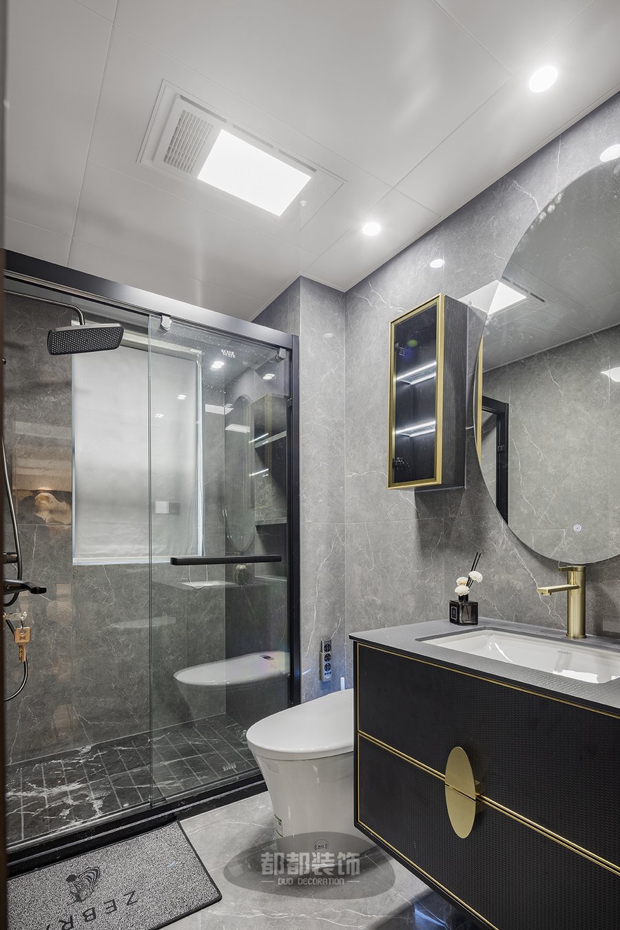 卫生间采用干湿分离的设计,墙地砖一体,视觉上更加统一,台下盆的收纳采用立体悬空设计,不会导致柜体受潮,化妆柜内白色灯带将空间照亮,这片光影给卫生间增添了一分如梦似幻的色彩,完美的诠释了空间里的光影之美。