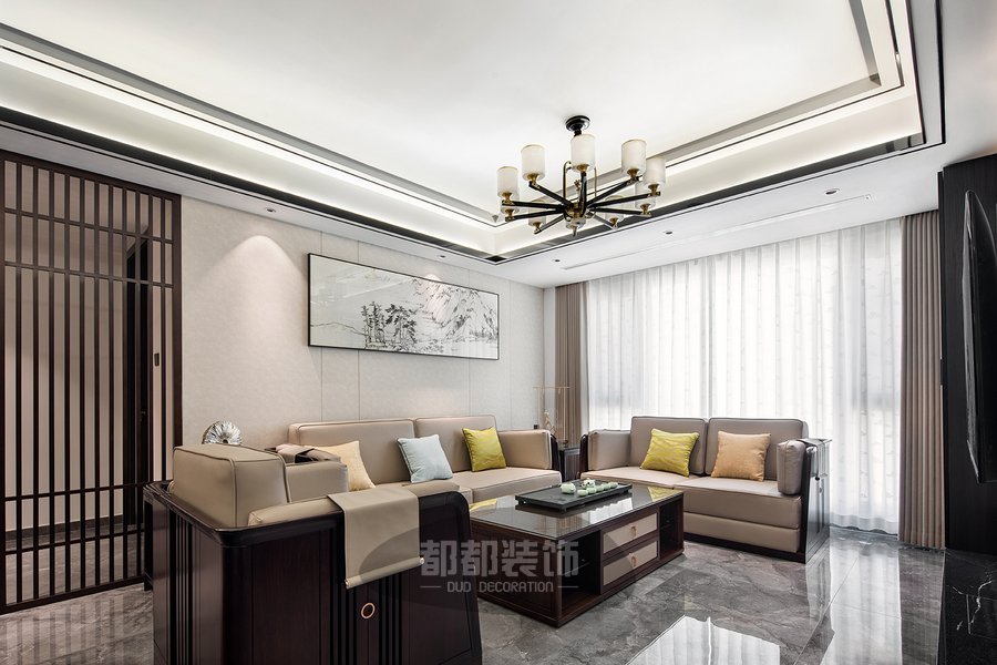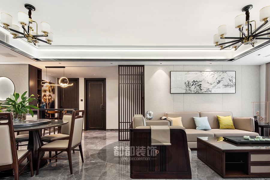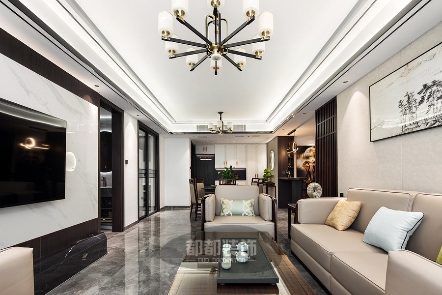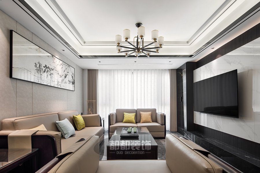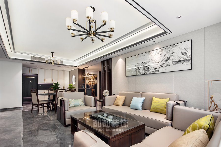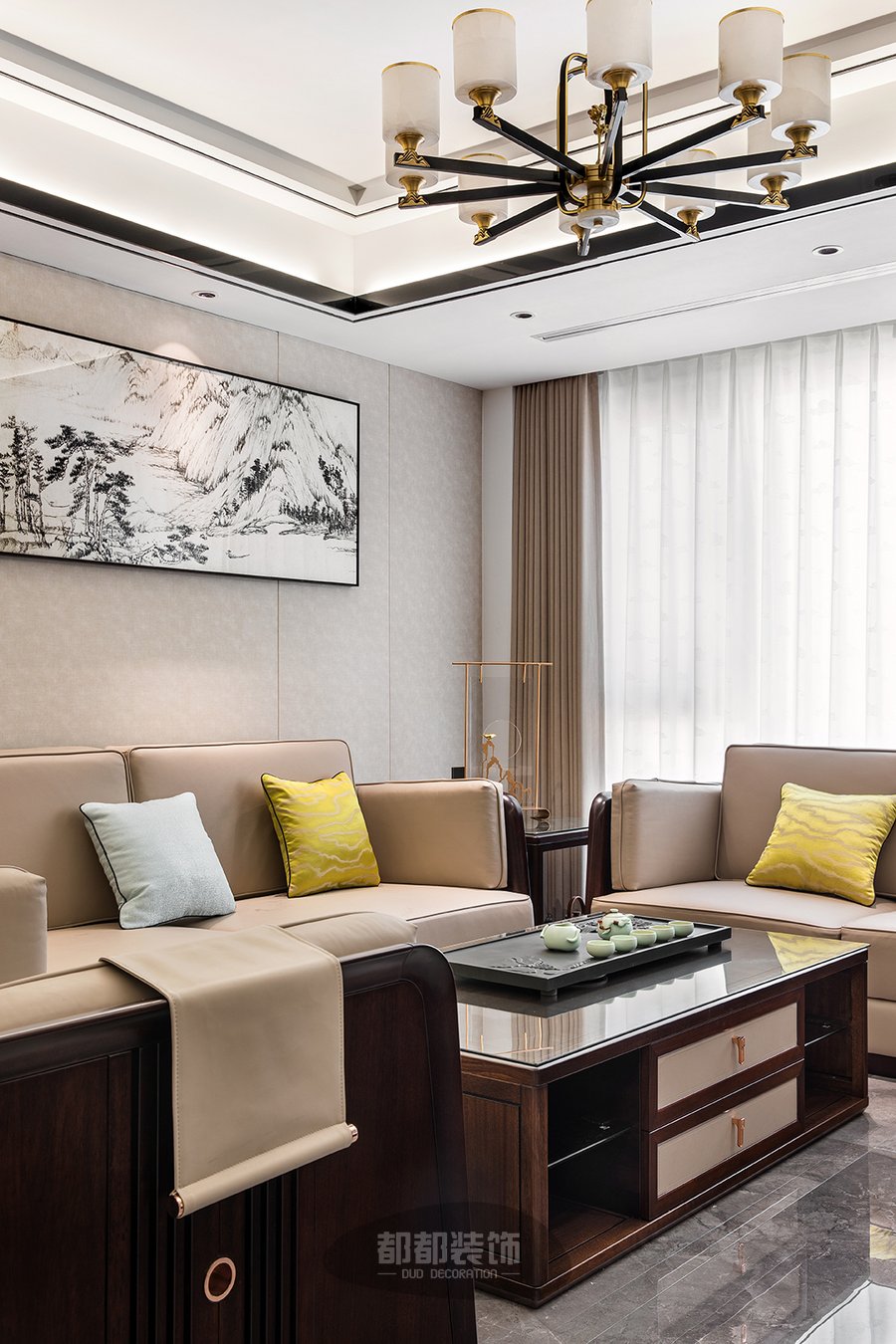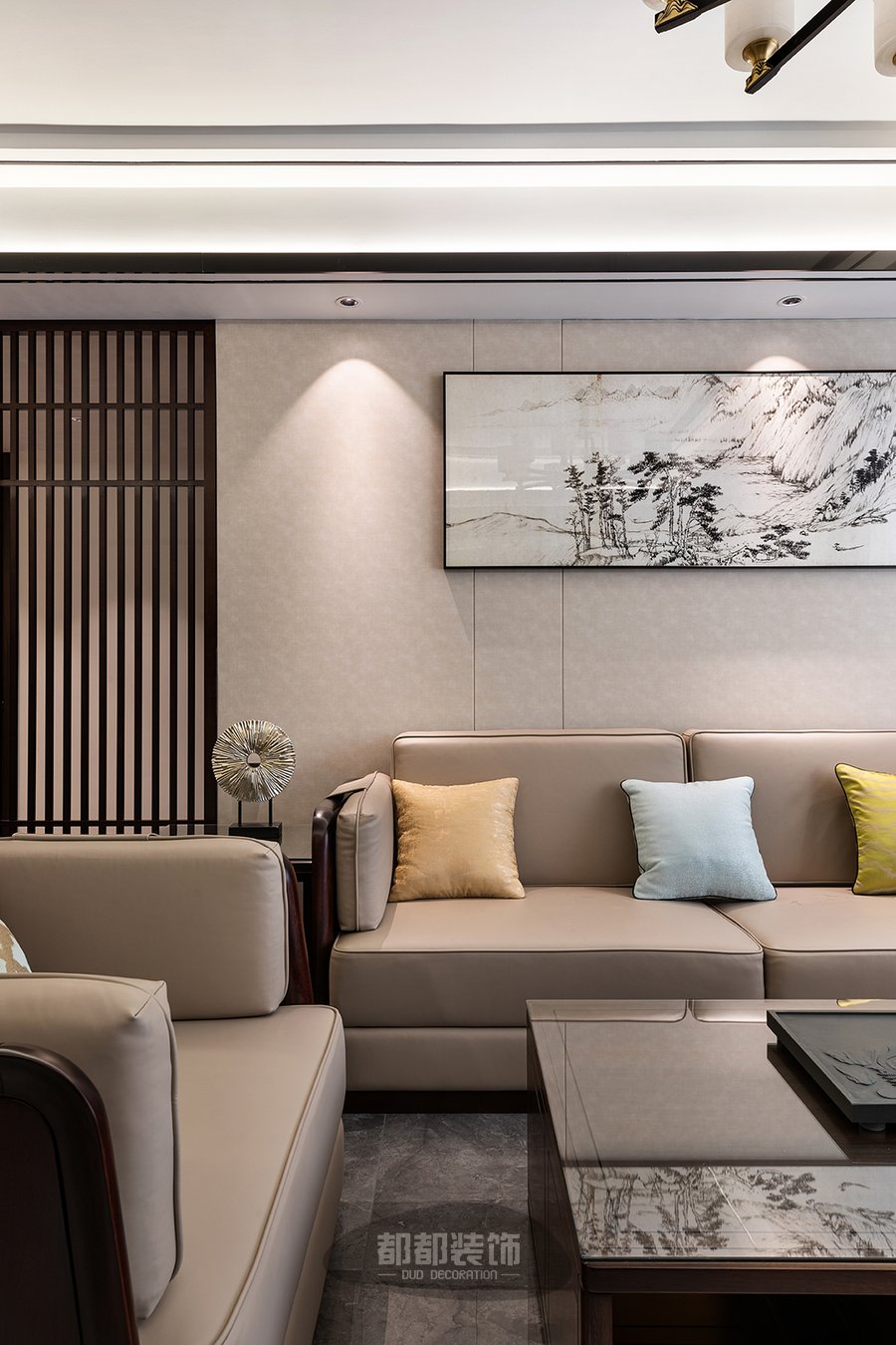 客厅内充满了静谧的浪漫氛围,光线在此时此刻似乎被赋予了浪漫的意义,淡雅低调的米色调搭配,彰显出主人的性格的内敛和气质,天然的山水壁画似乎在诉说着历史,柔软的沙发勾勒出了一个温和的世界。