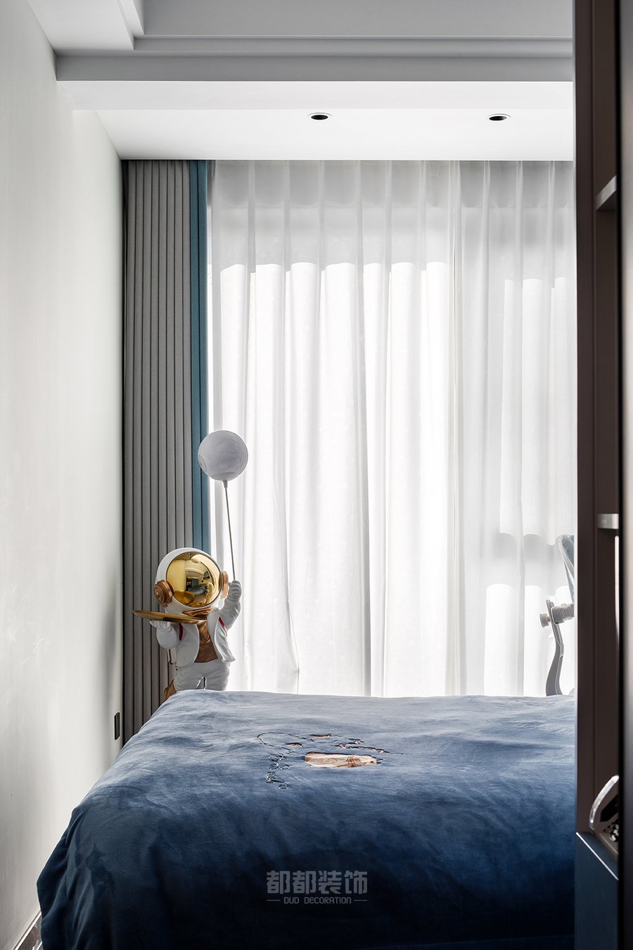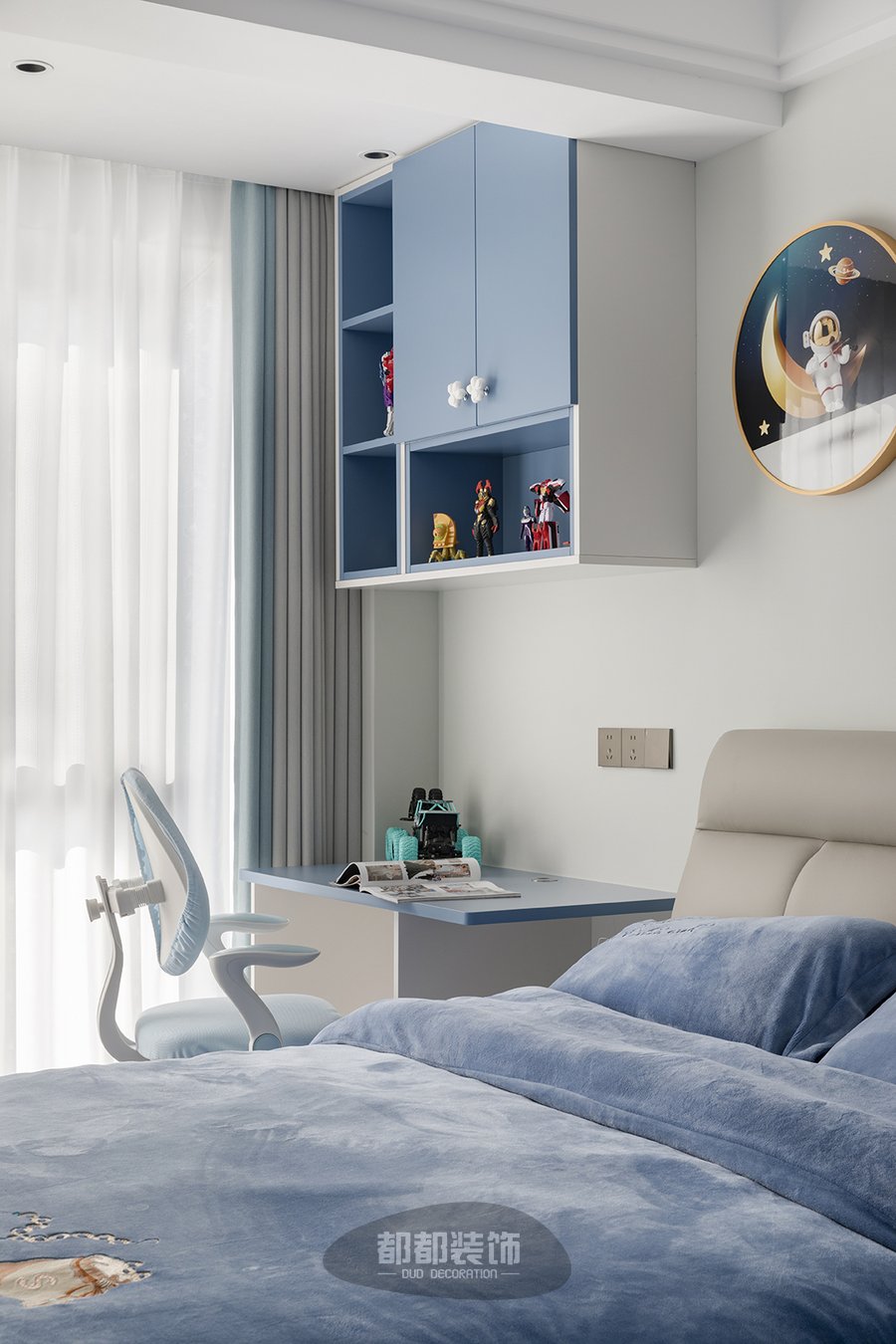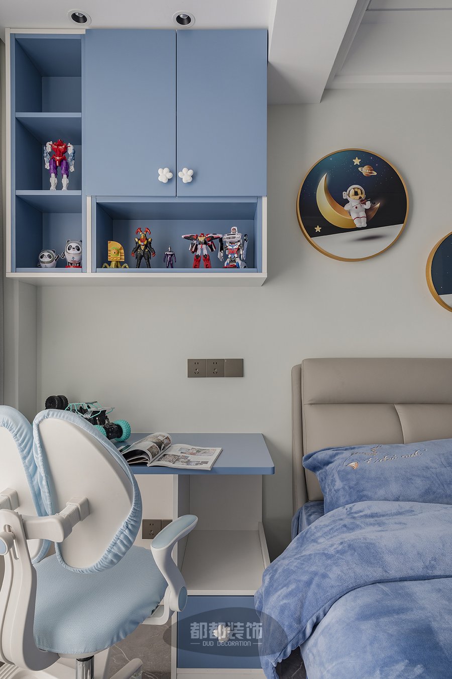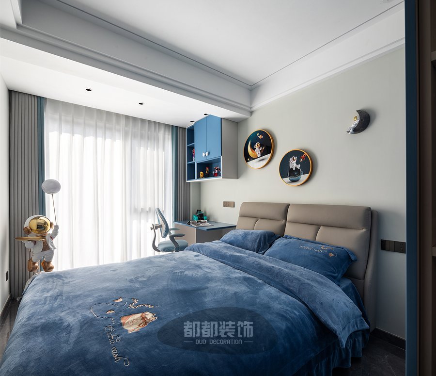 男孩房以宇宙作为主题,在蓝色的浩瀚之中蕴藏着儿童们那颗天真烂漫的童心,这间卧室的主色调为蓝色,蓝色的静谧和高级让整个卧室瞬间高贵了起来,阳光洒在书桌上,洒在床单上,洒在椅子上,静谧而又美好。