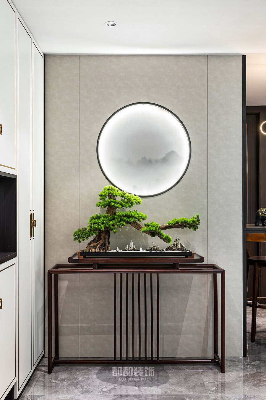 作为开门的第一道风景,设计师用到了圆形影壁、绿植和木色玄关台等中国风元素来展现一种含蓄的美,棕色的木质材料流露出浓浓的自然气息,绿色植物让空间变得更加活跃靓丽,这样古典与现代的结合超完美!