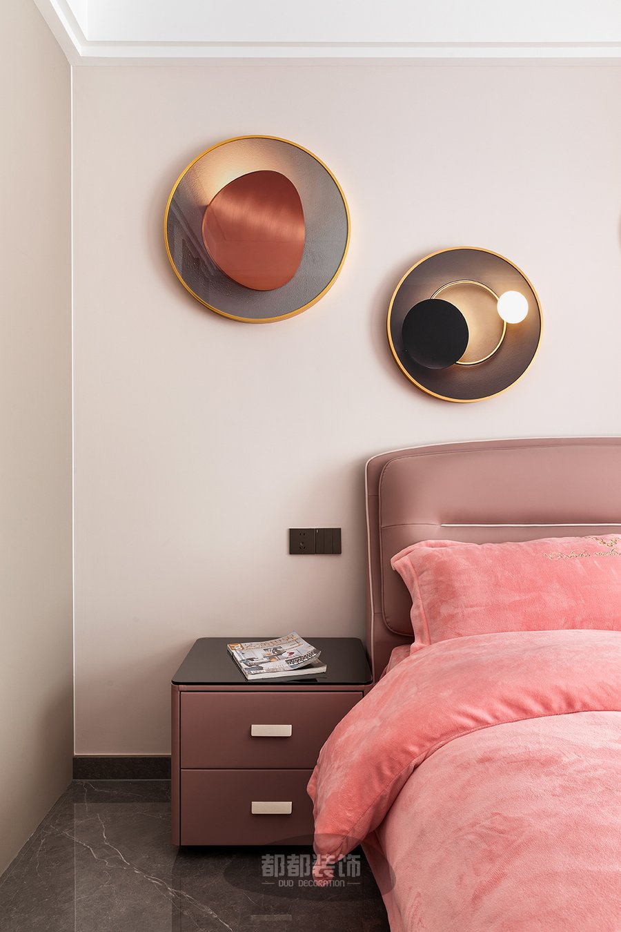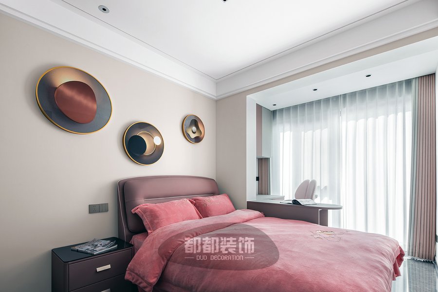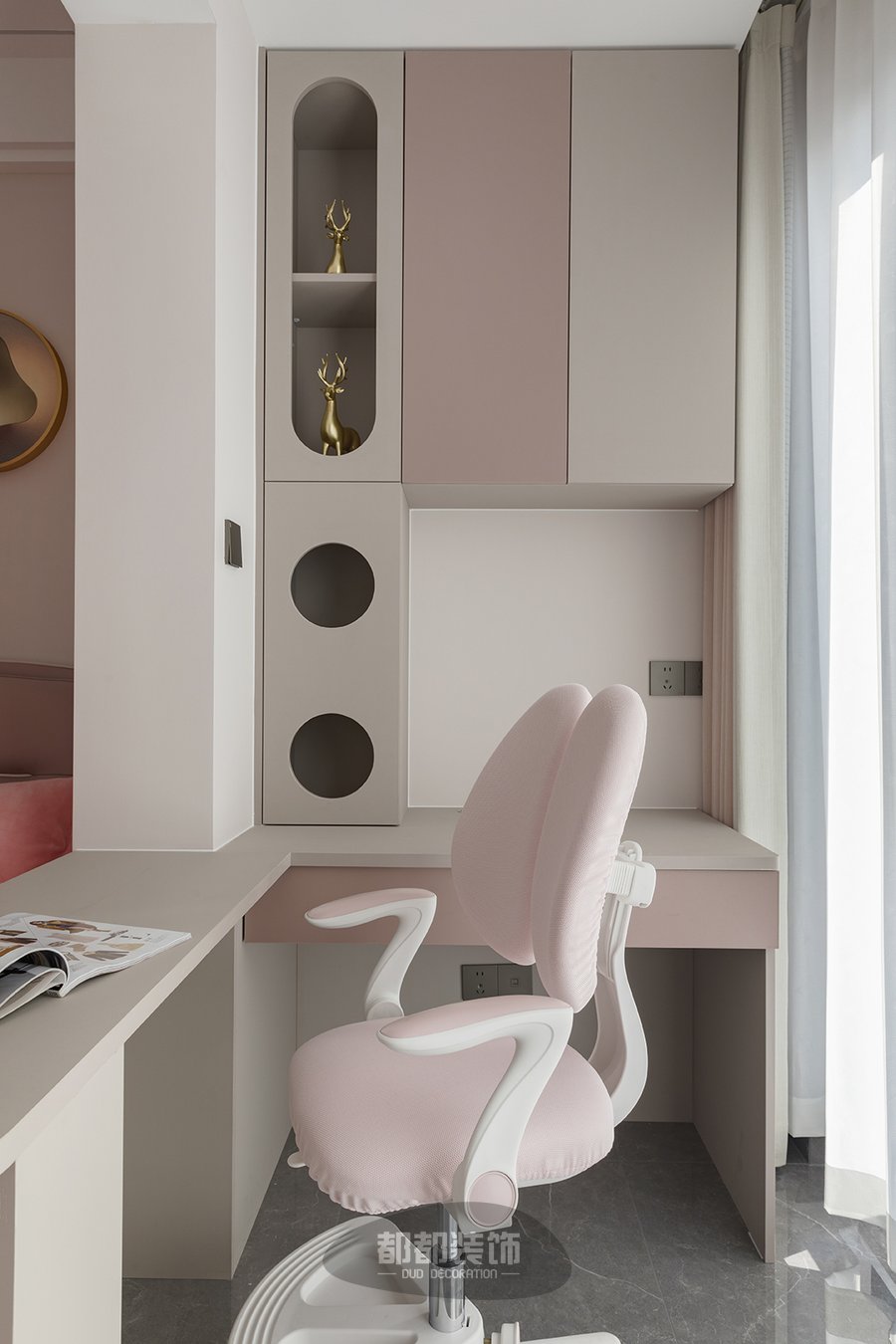 主卧整个空间以粉色为主,透过白色的薄纱窗帘,室内更多了些许的朦胧感,是温馨的,也是浪漫的,半包围的书桌真的太有安全感了!满足使用功能的同时又不失艺术性;拱形柜门和小鹿摆件的点缀,给卧室打造一个灵动又软萌的室内空间。