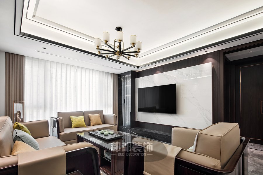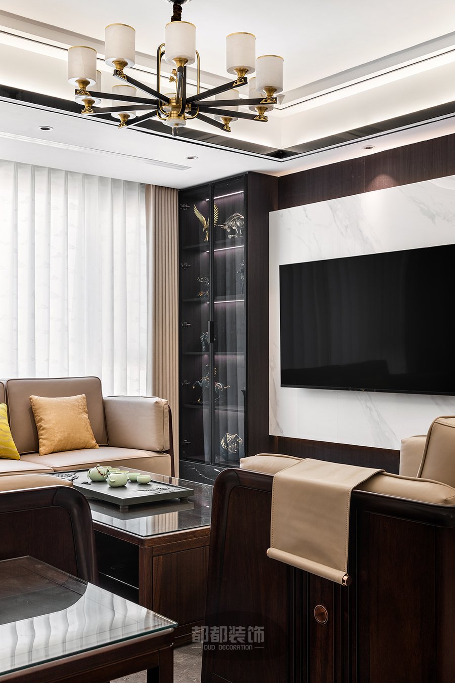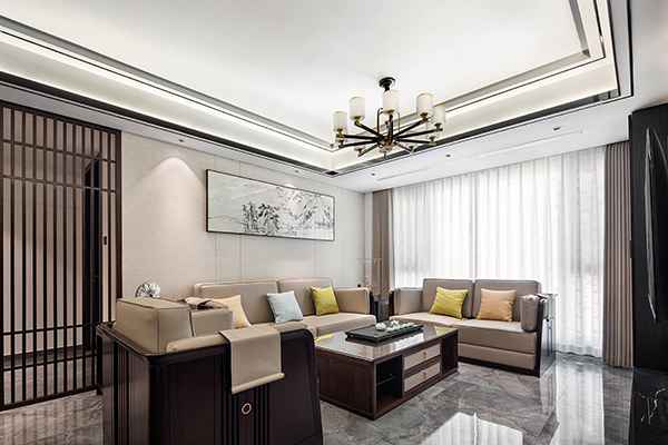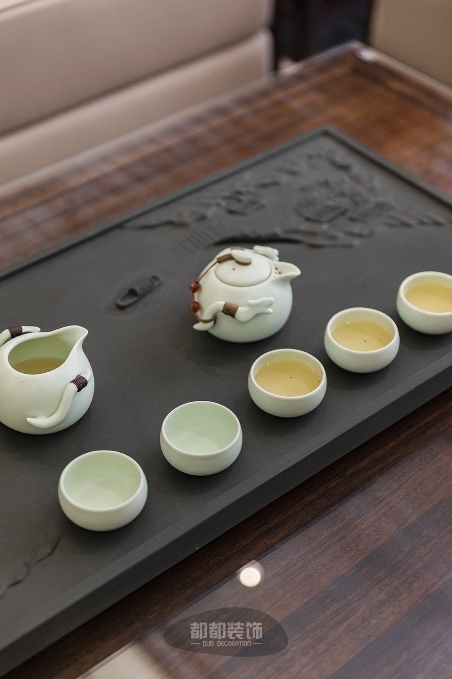 宽大的杏色沙发让整个客餐厅的设计显得雍容华贵,气派非凡,搭配古色古香的茶几和茶具,将现代和传统元素结合在一起,运用简约大气的手法,为黄总营造一处经典、气派的大居所,体现出黄总优雅舒适的生活态度。