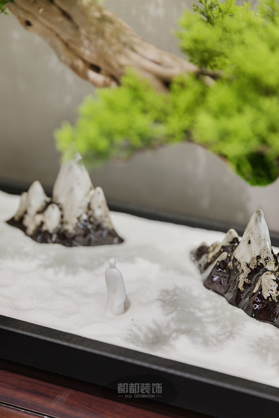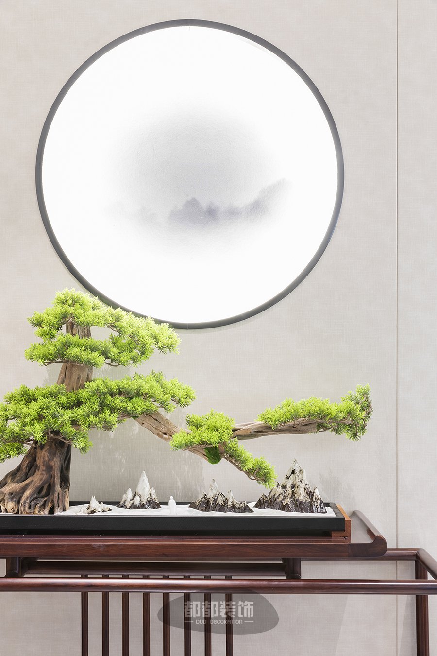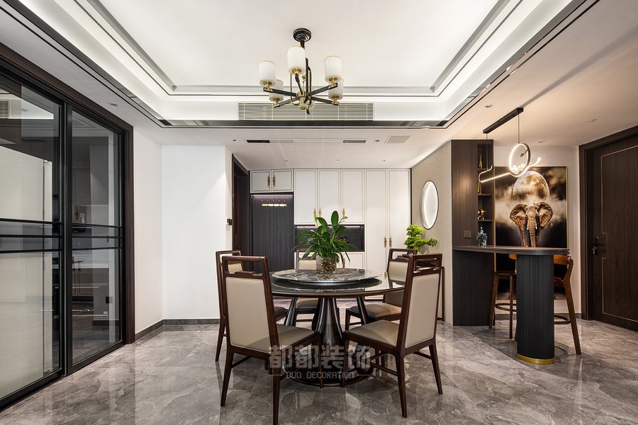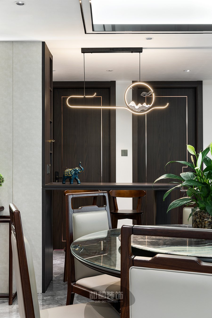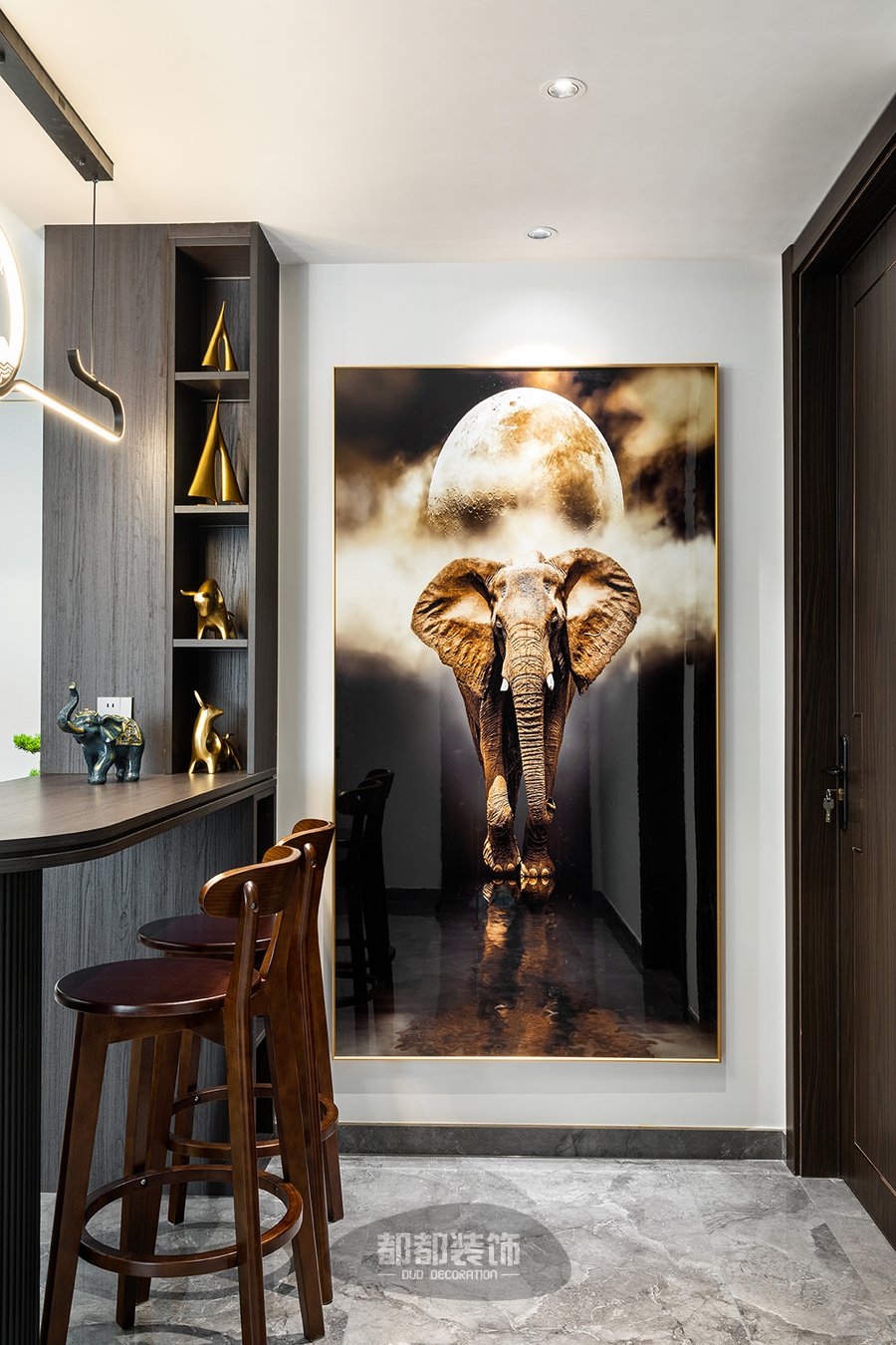 大象装饰的背景墙让吧台沉浸在一片野性氛围之中,吧台茶香随风弥漫,茶道精神也随之飘散,上方祥云线性灯让家充满了希望和活力,这个空间更多的诠释了文化的魅力,更好的展现了东方的美,从细节到整体,都充盈着质朴和纯粹。