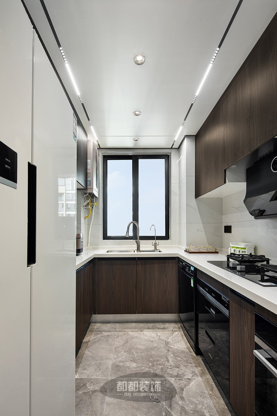 厨房空间狭小但是视野开阔,适高的台面让业主洗菜不弯腰,炒菜不架手,让生活更加便利,U型的超大操作台设计可以随心所欲的摆放用具,一排整齐的底柜+吊柜,充分满足收纳需求,高级棕的配色将精致美感过渡到了烟火人间。