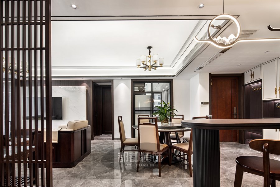 出于一家人对木质家具的喜爱,此次餐厅设计中运用了很多深色木质元素,这也是东方韵律的智慧,桌面上的白掌绿植也在室内慢慢的享受着这缓缓流淌的时光,精致的六角吊灯让每一餐都变得仪式感十足。
