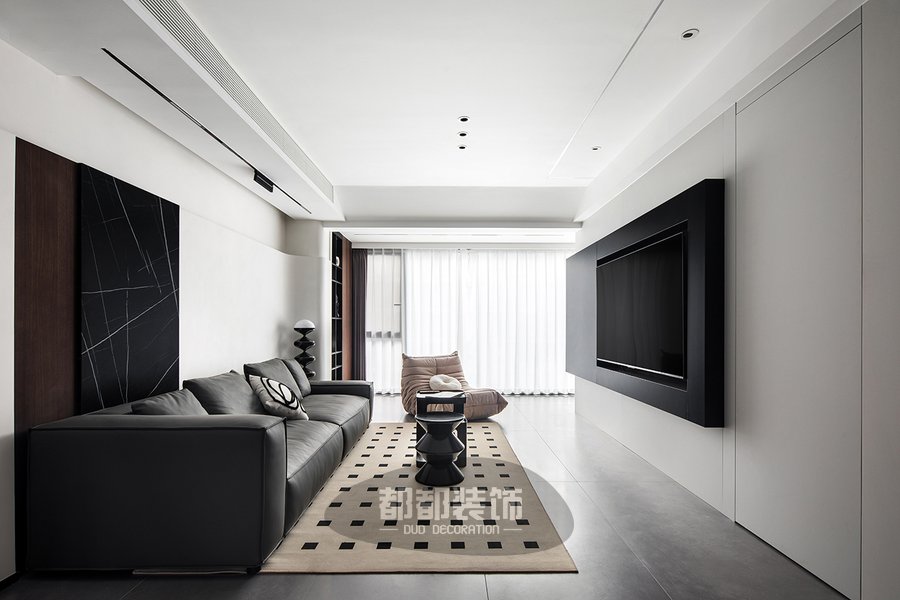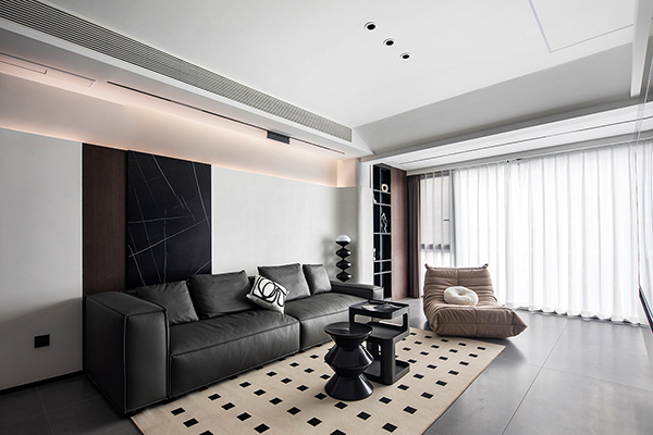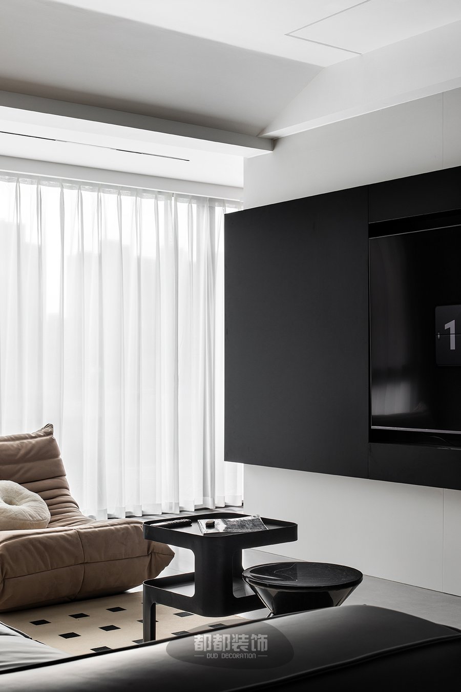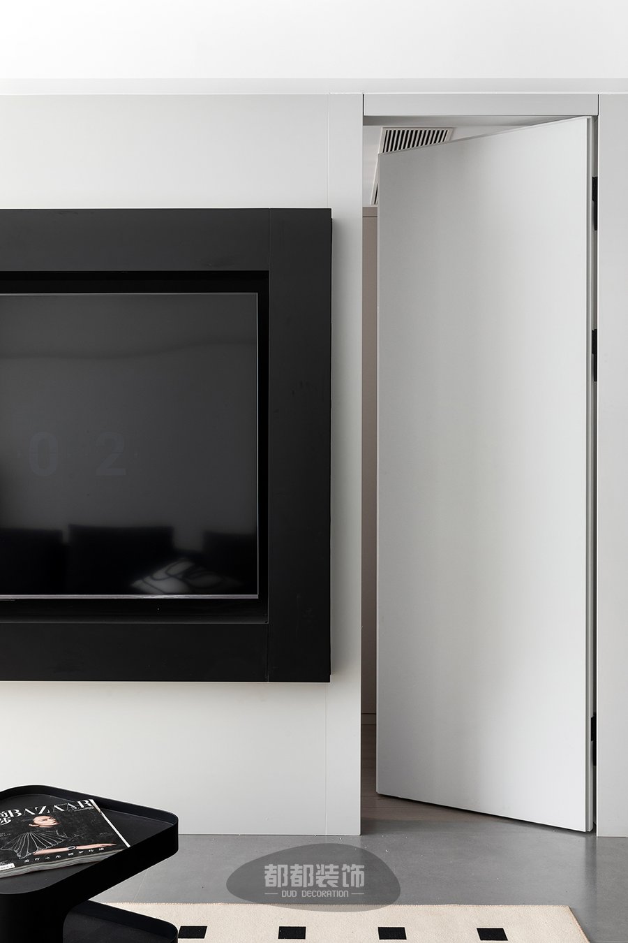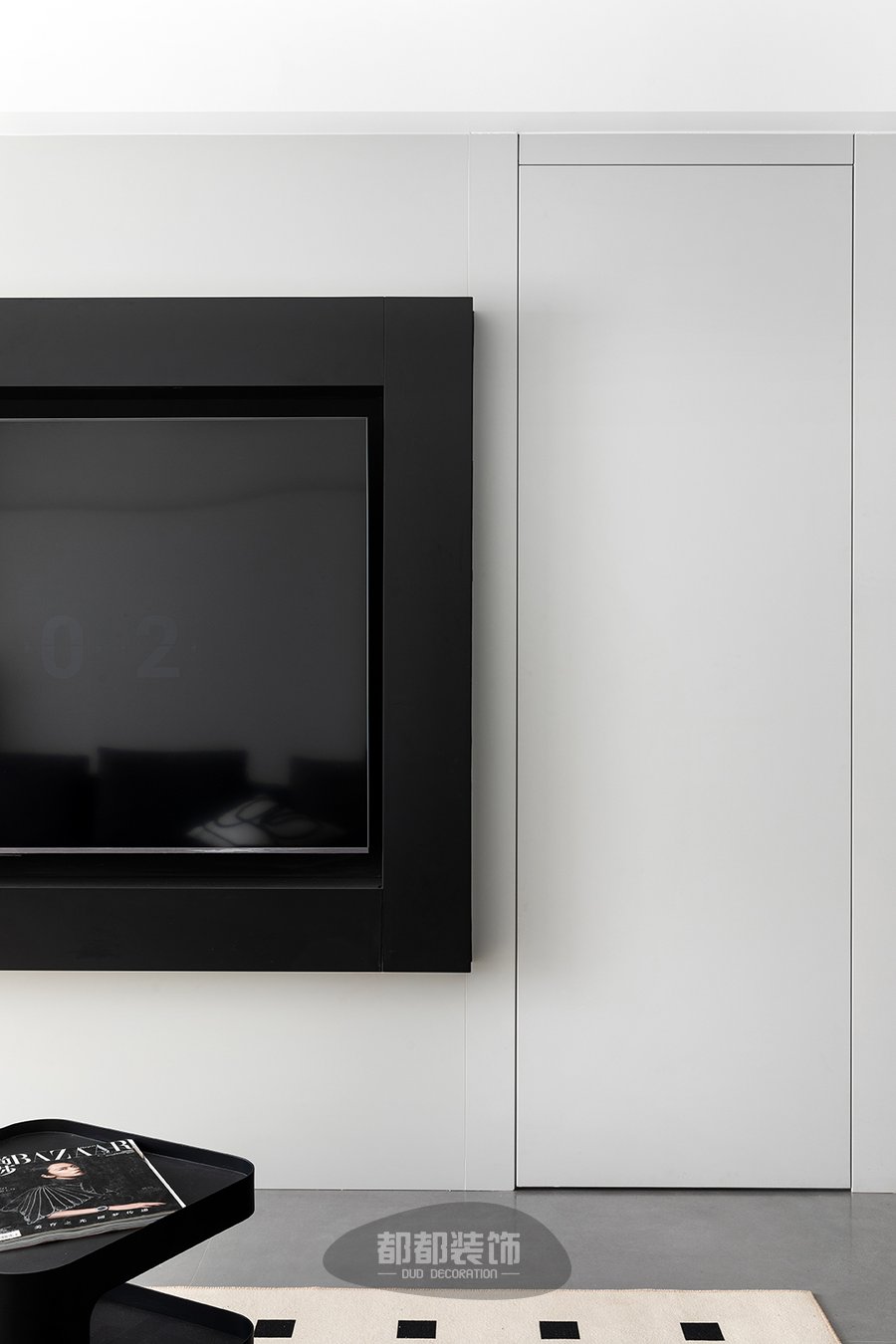 电视背景墙层次分明,低饱和度白色木饰面做底,局部拼接黑色护墙板,反差色制造视觉惊喜,因为客厅的墙面有多个房间的通道,于是设计师将次卧门做了隐形处理,界面整洁又轻盈。