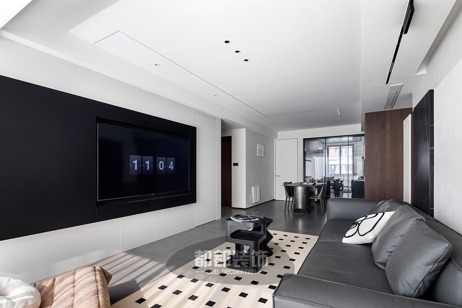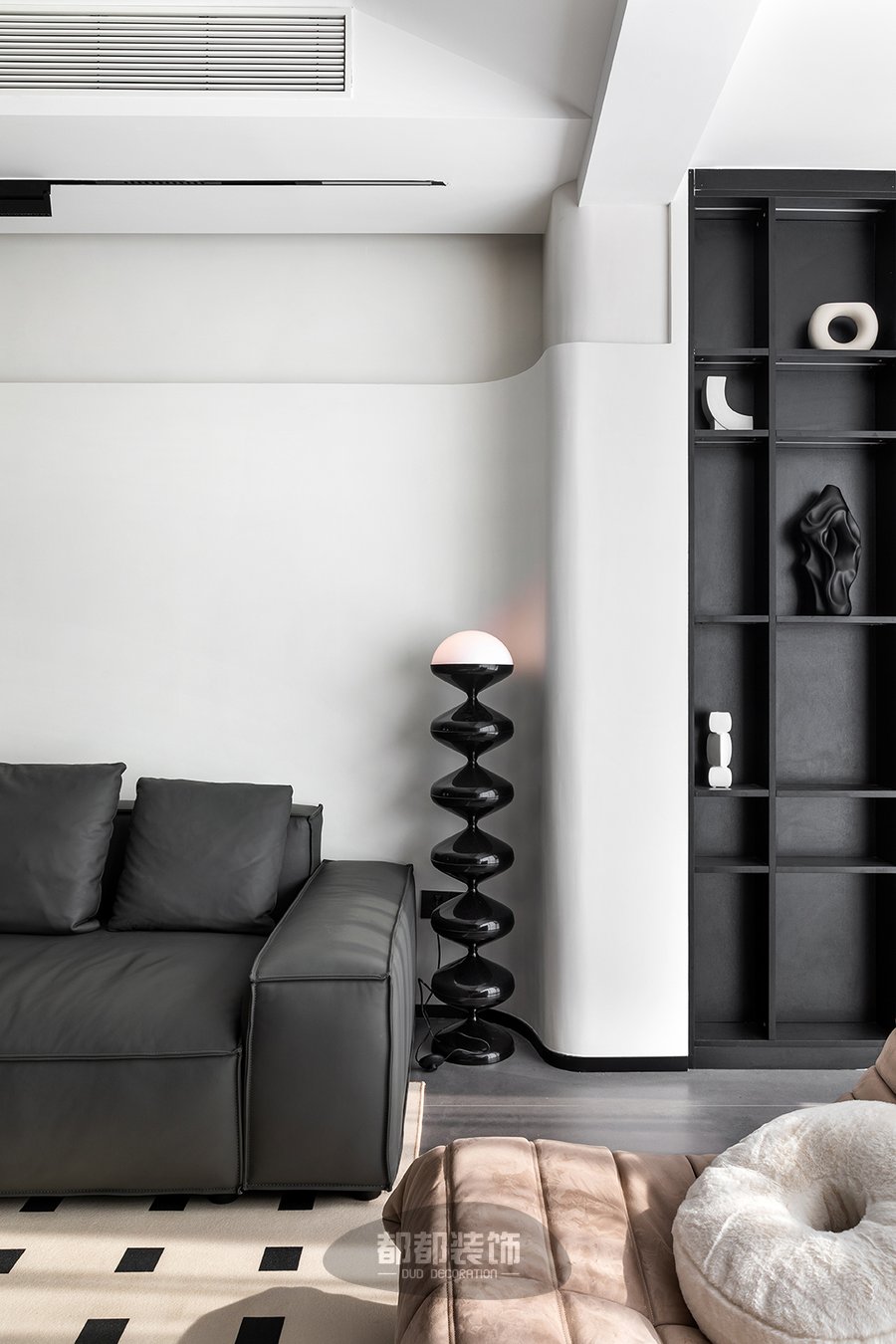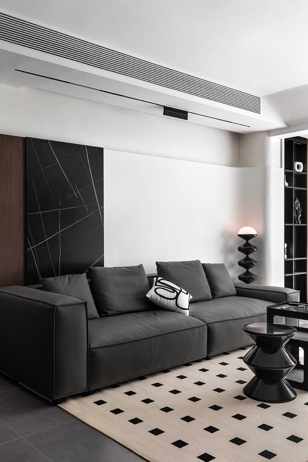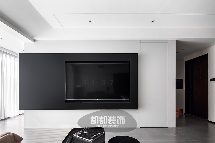 电视背景墙层次分明,低饱和度白色木饰面做底,局部拼接黑色护墙板,反差色制造视觉惊喜,因为客厅的墙面有多个房间的通道,于是设计师将次卧门做了隐形处理,界面整洁又轻盈。