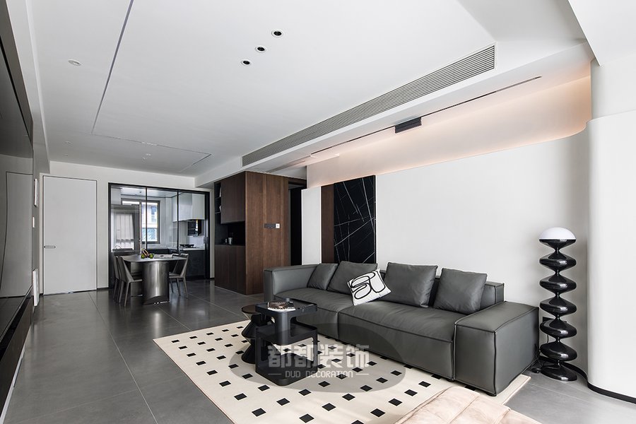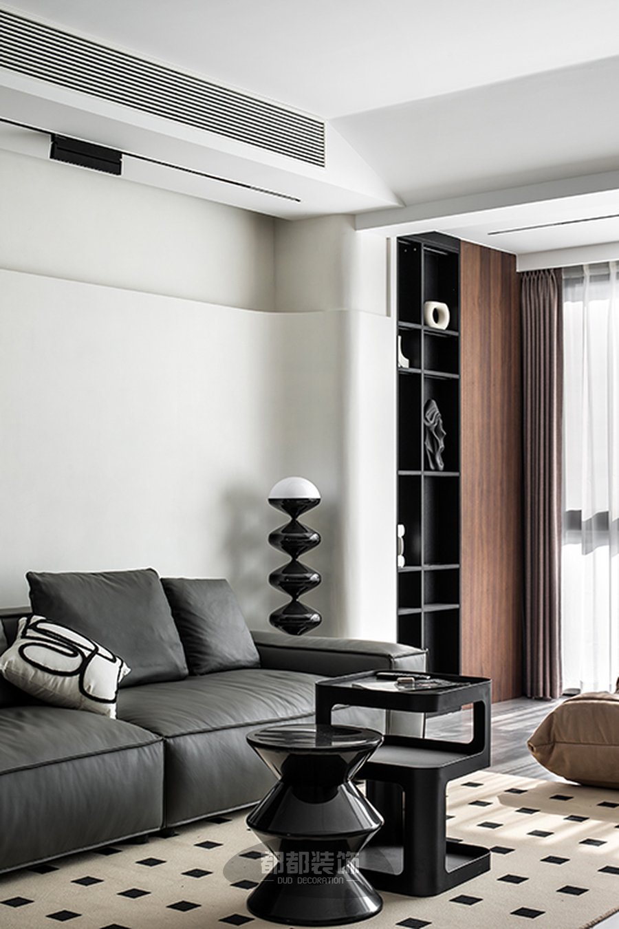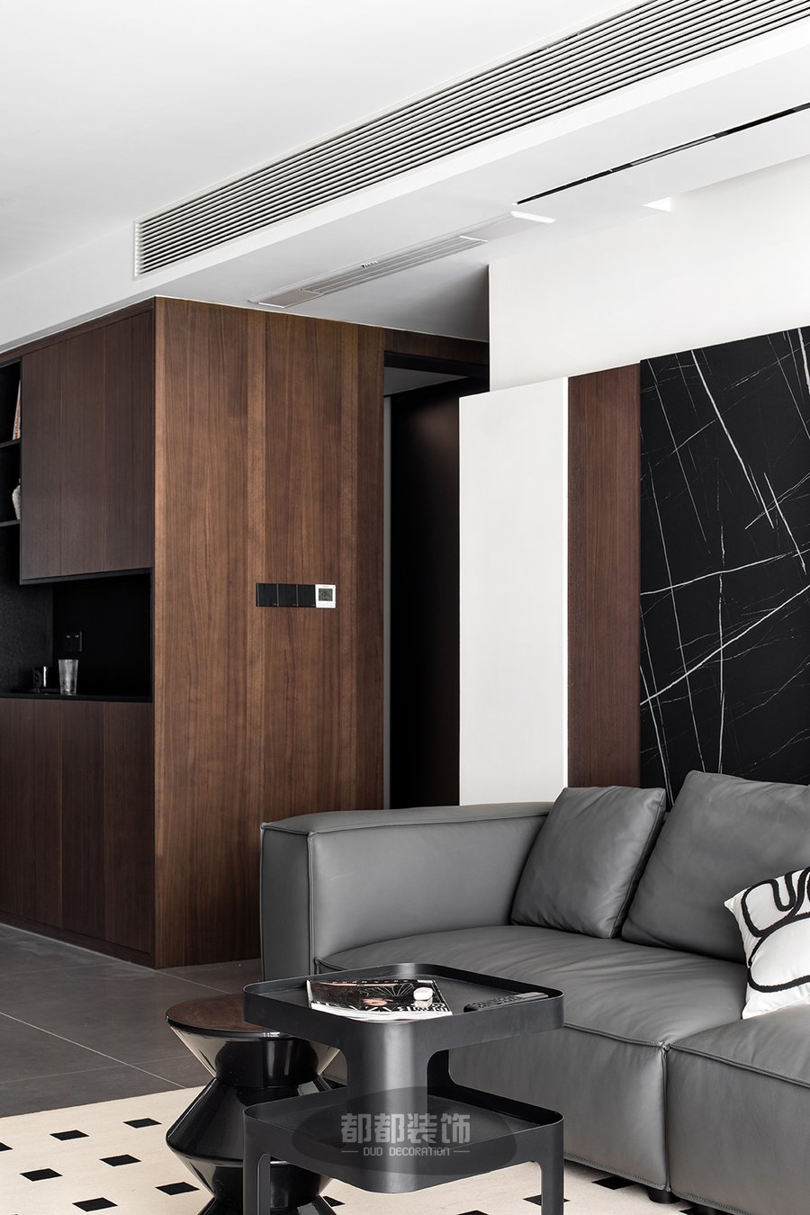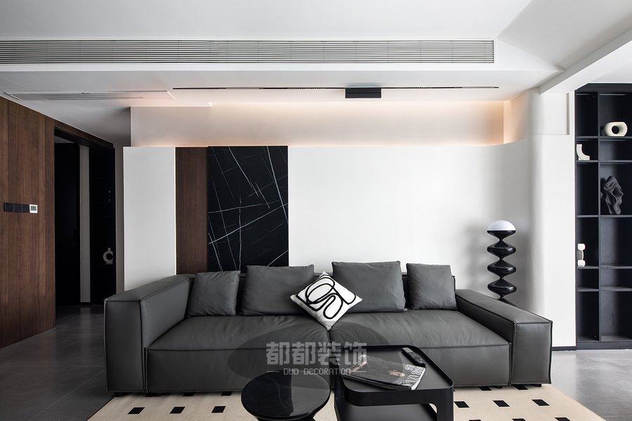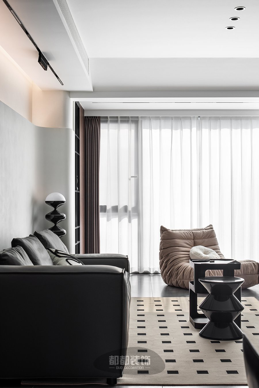 电视背景墙层次分明,低饱和度白色木饰面做底,局部拼接黑色护墙板,反差色制造视觉惊喜,因为客厅的墙面有多个房间的通道,于是设计师将次卧门做了隐形处理,界面整洁又轻盈。