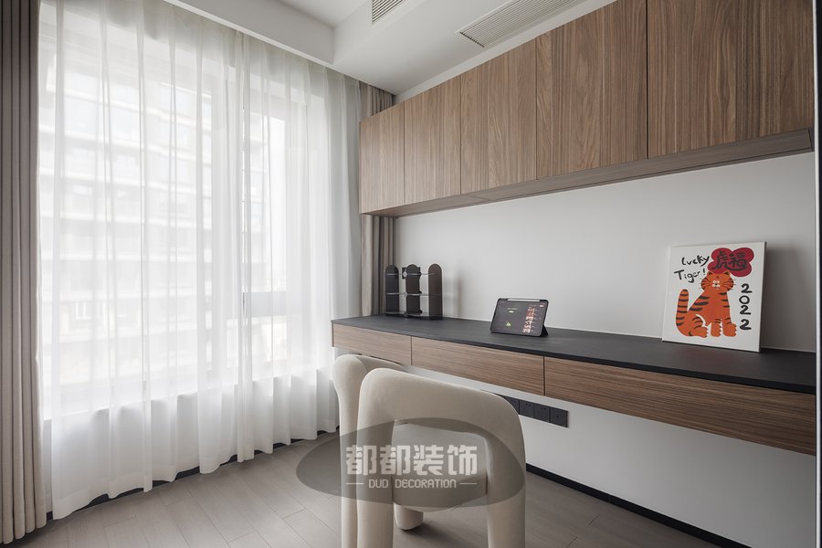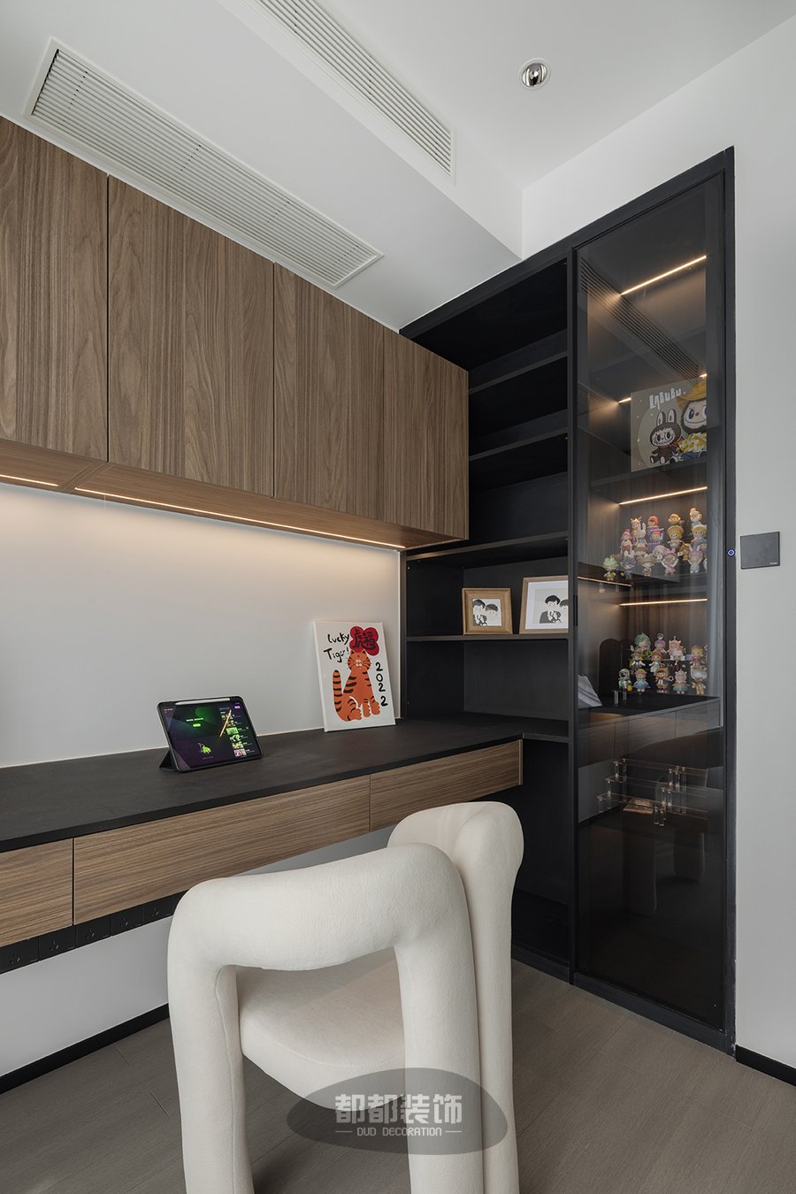 书房设计遵循功能至上的原则,悬空书桌+吊柜设计简直将这个寸金寸土的小空间发挥到极致,靠墙做了整墙收纳柜,部分开放格设计放些杂物拿取也很方便,玻璃柜内灯带让光线近距离的照亮每一个角落,让手办娃娃们不再孤单!
