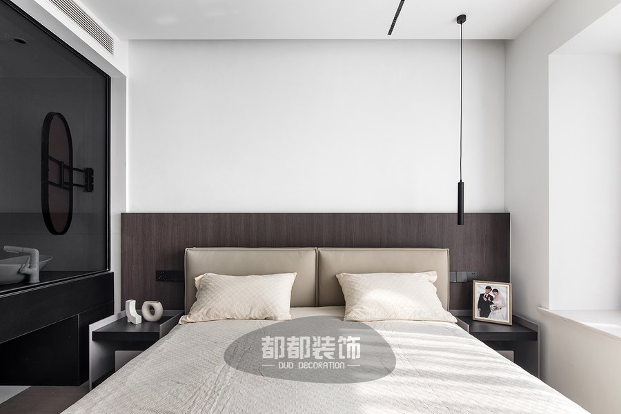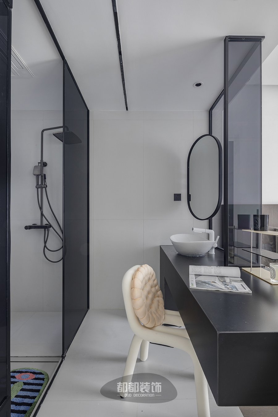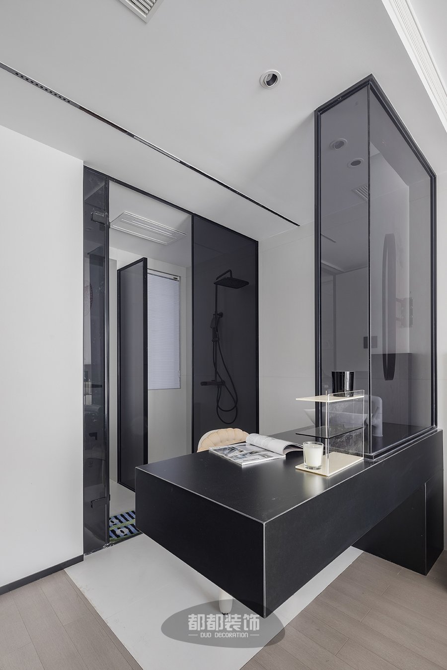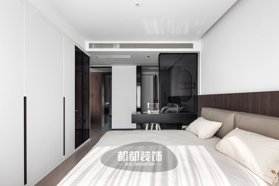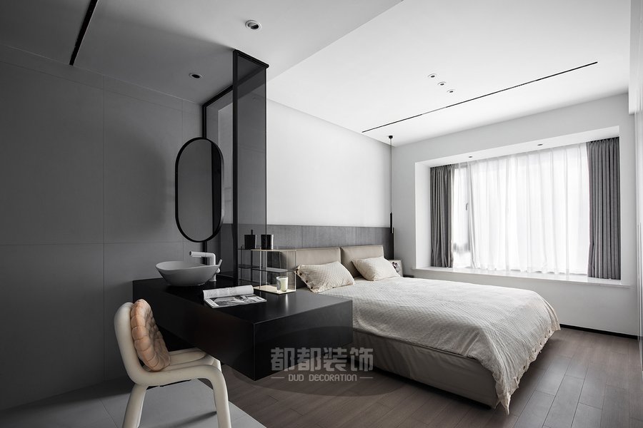 云想衣裳花想容,对于爱美的女生来说,美好的一天,总是从化妆开始的,设计师将梳妆台设置在床和卫生间门之间,洗漱完可以直接进行护肤程序,接着上妆、清洁台面一套流程干净利落。