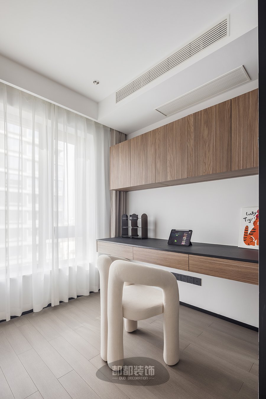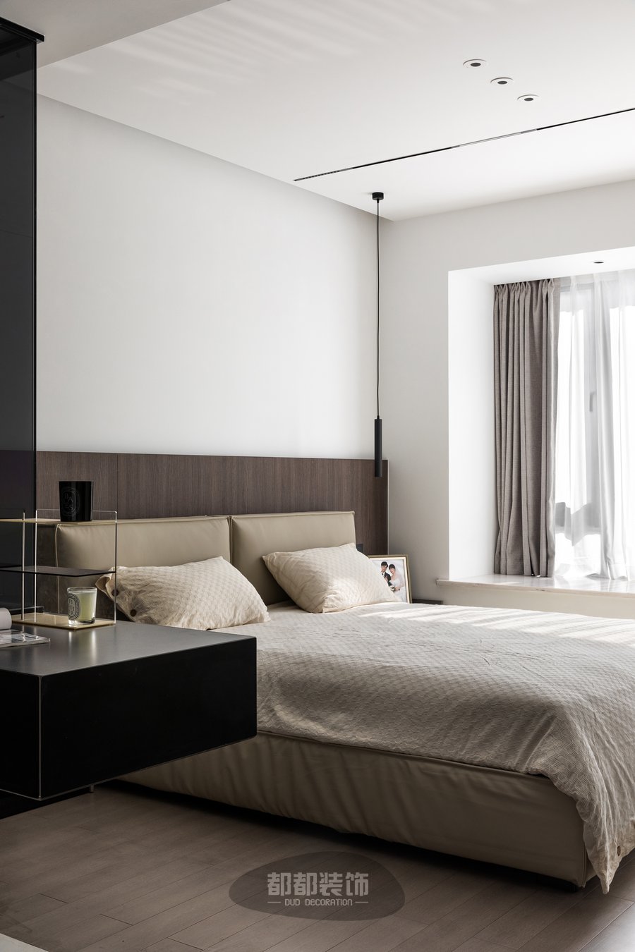 摩卡木饰面搭配米白色床品,营造出一个清新、恬适的睡眠空间,软包床背、木质床头柜和布艺窗帘都选择了奶咖色,平和而温柔的触感,不经意间便将白日的疲惫尽数消解,让人尽享轻松与舒适。