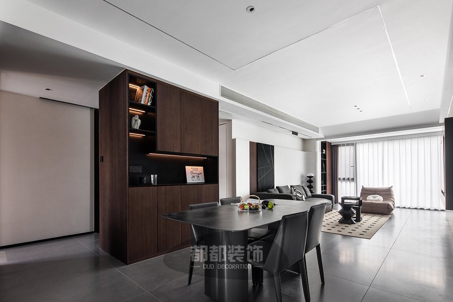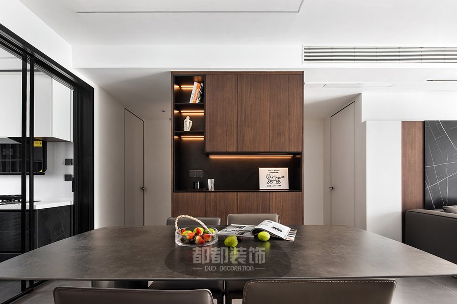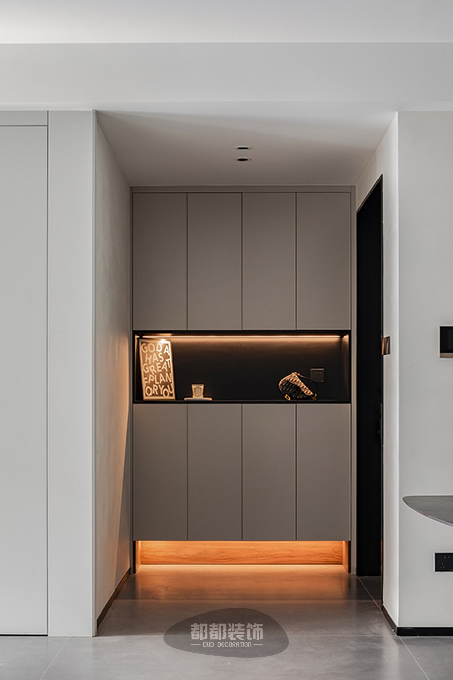 一进门便能被这暖红的深邃空间所吸引,无把手的光滑柜面减轻入户后的视觉压力,玄关设计隐藏灯带做照明装置,中空橡木黑与精心选择的暖色灯相互映衬,光影之下,港式风情呼之欲出。
