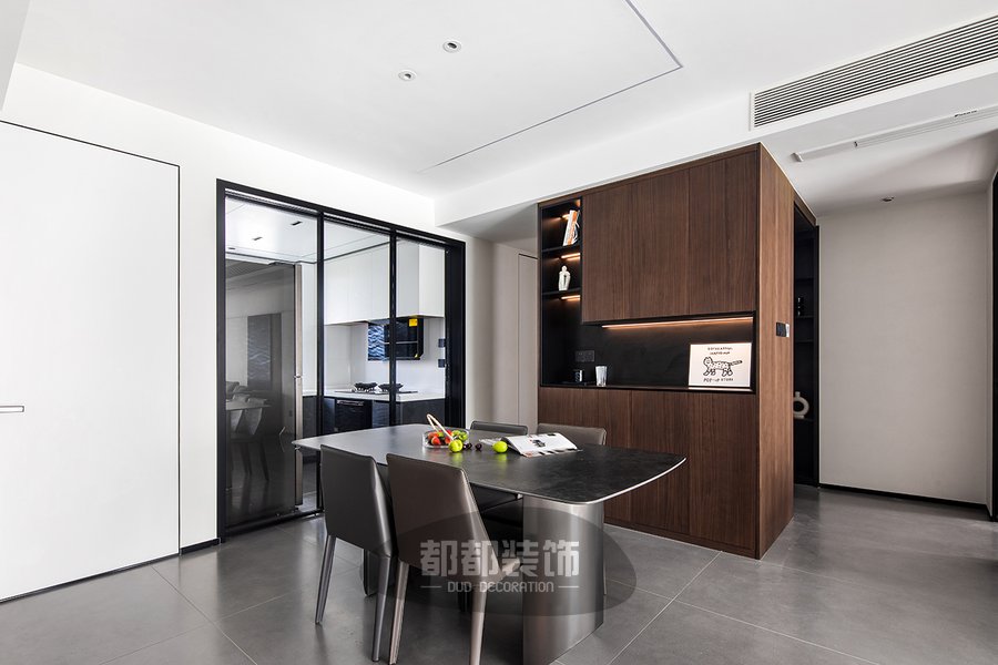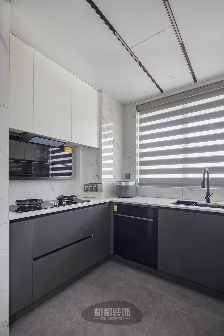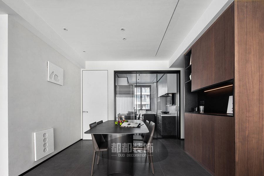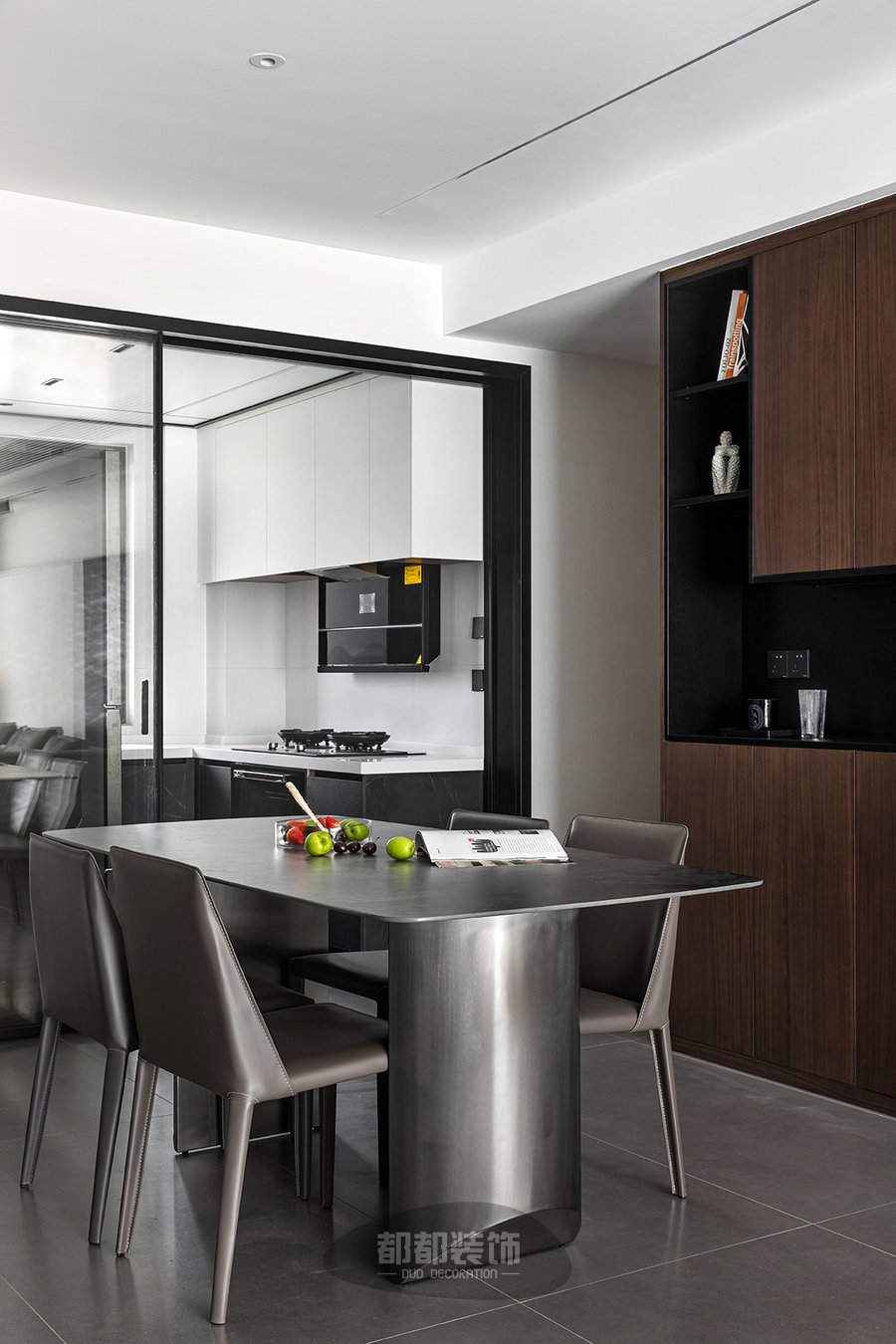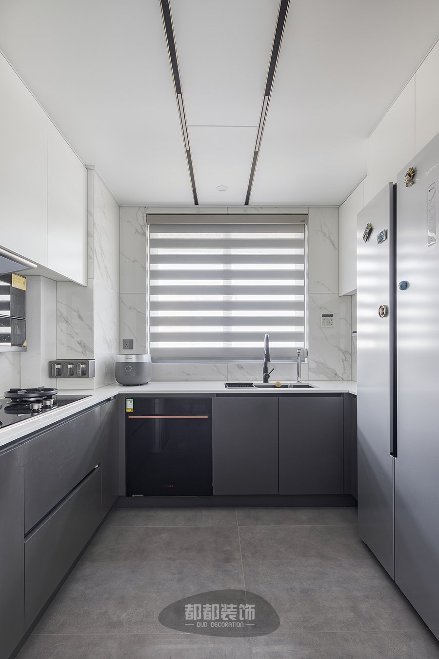 厨房和餐厅之间用双扇吊滑门作为隔断,起到避免油烟扩散的作用;材质选择透明玻璃+黑色框架不仅保证了空间的通透性,看起来也十分高级大气,L形格局非常适合这种瘦长型厨房,能让烹饪者的操作过程便利化和快捷化,双开门冰箱被镶嵌在墙壁内侧,提高了空间利用率。