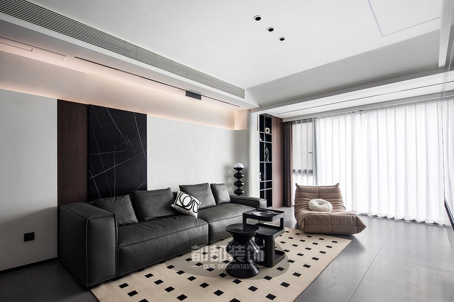 步入客厅就能感受到浓厚的现代摩登之感,就像身处在时尚画报中,黑白素色的基调,映射出阳光明媚的同时还带着冬日的安静淡然,顶部环绕的灯带搭配分列有序的筒灯,客厅完全被光域覆盖,不同色温的灯光交织,为空间染上一层神秘色彩。