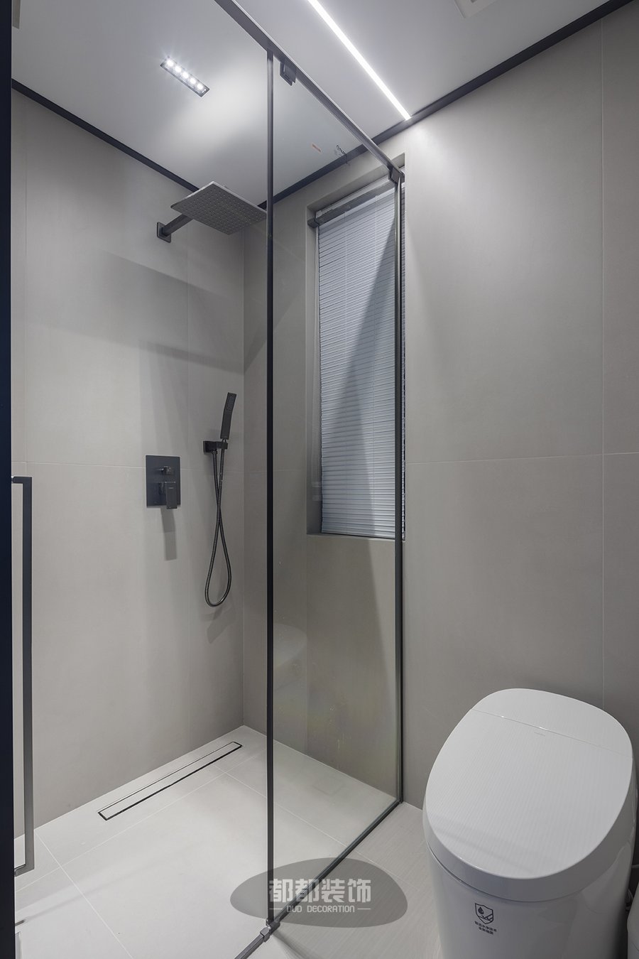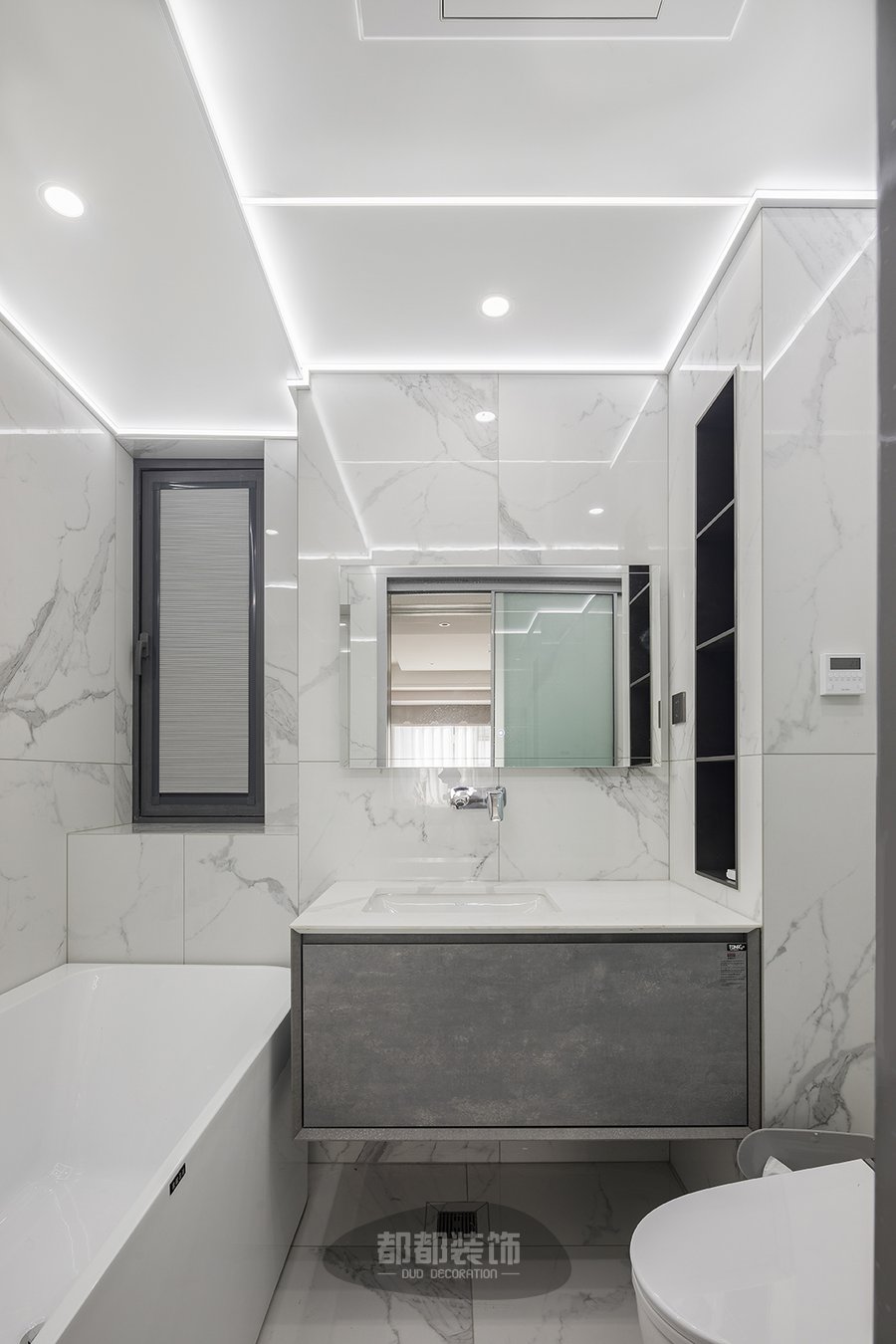 将洗手台外移,实现了彻底的干湿分离,同时原本面积不大的卫生间,使用舒适度也更高,在一片纯白的空间中,深邃的黑色柜面将原本的沉寂打破,注入灵动和生机感;储物柜下方悬空,充分隔离了地面湿气;安装灯带,晚上上厕所时就不用怕黑了~