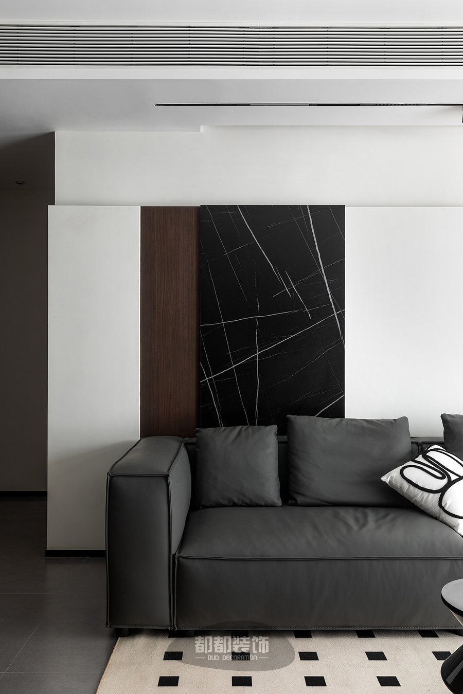 灰色的皮质沙发,墙面搭配组合大理石板,使得空间层次错落,视觉感更丰富;涂鸦式抱枕独特的随性感与空间配色相衬,交织出潮味十足的氛围。