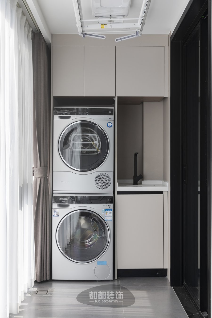 阳台区域较为整洁,浅灰色铺底有放大视觉的效果,搭配白色的收纳柜也不突兀,银灰色洗烘机带来恰到好处的层次、色彩变化。