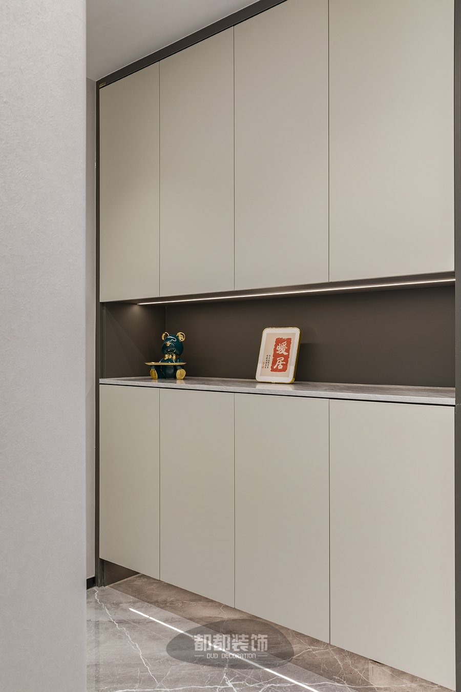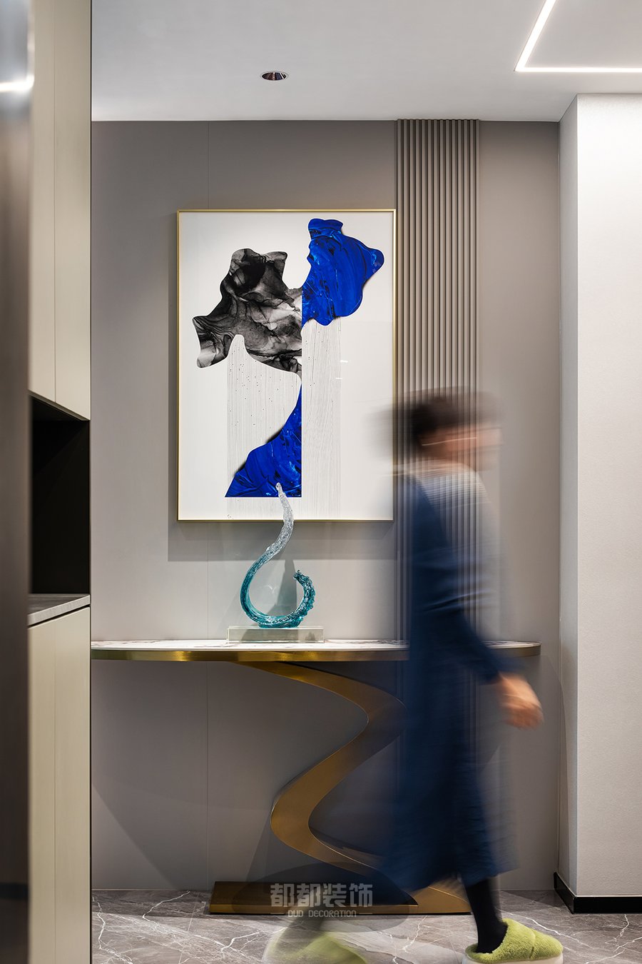 吴女士家的玄关区由收纳柜和展示台组成,立体格栅+流体装饰画形成一种影影绰绰的视觉穿透感,演绎自然景象中的诗意美学;左手侧打造无把手设计的玄关柜底部留出10公分的方便常用的鞋直接踢进去放好,中空部位是深棕色的木调,优雅大方。