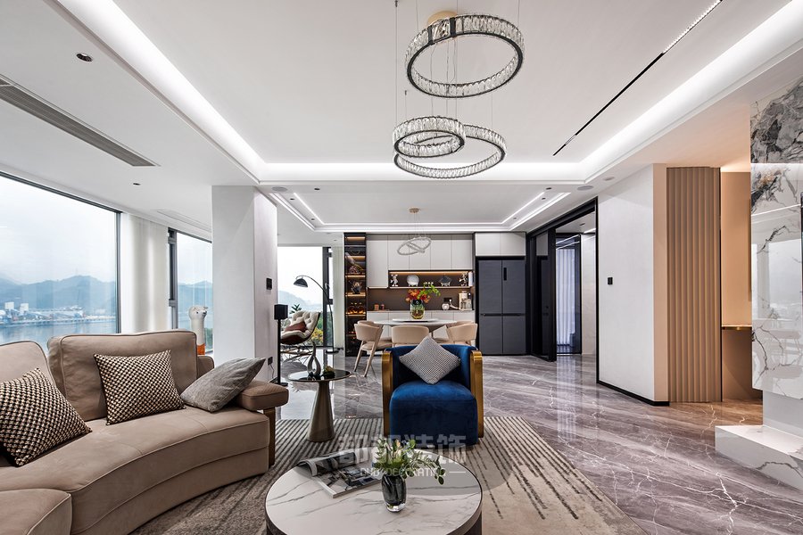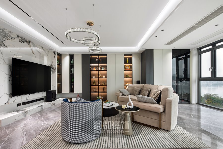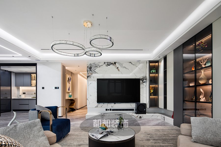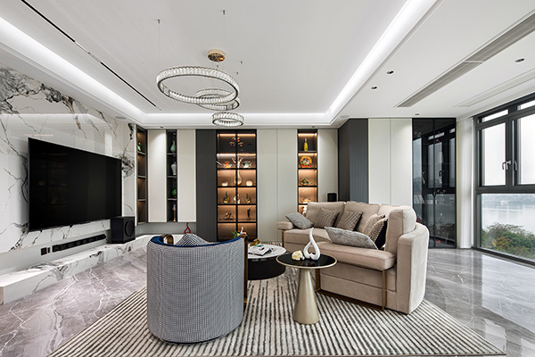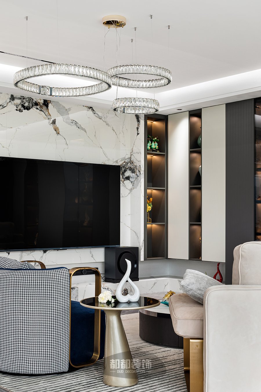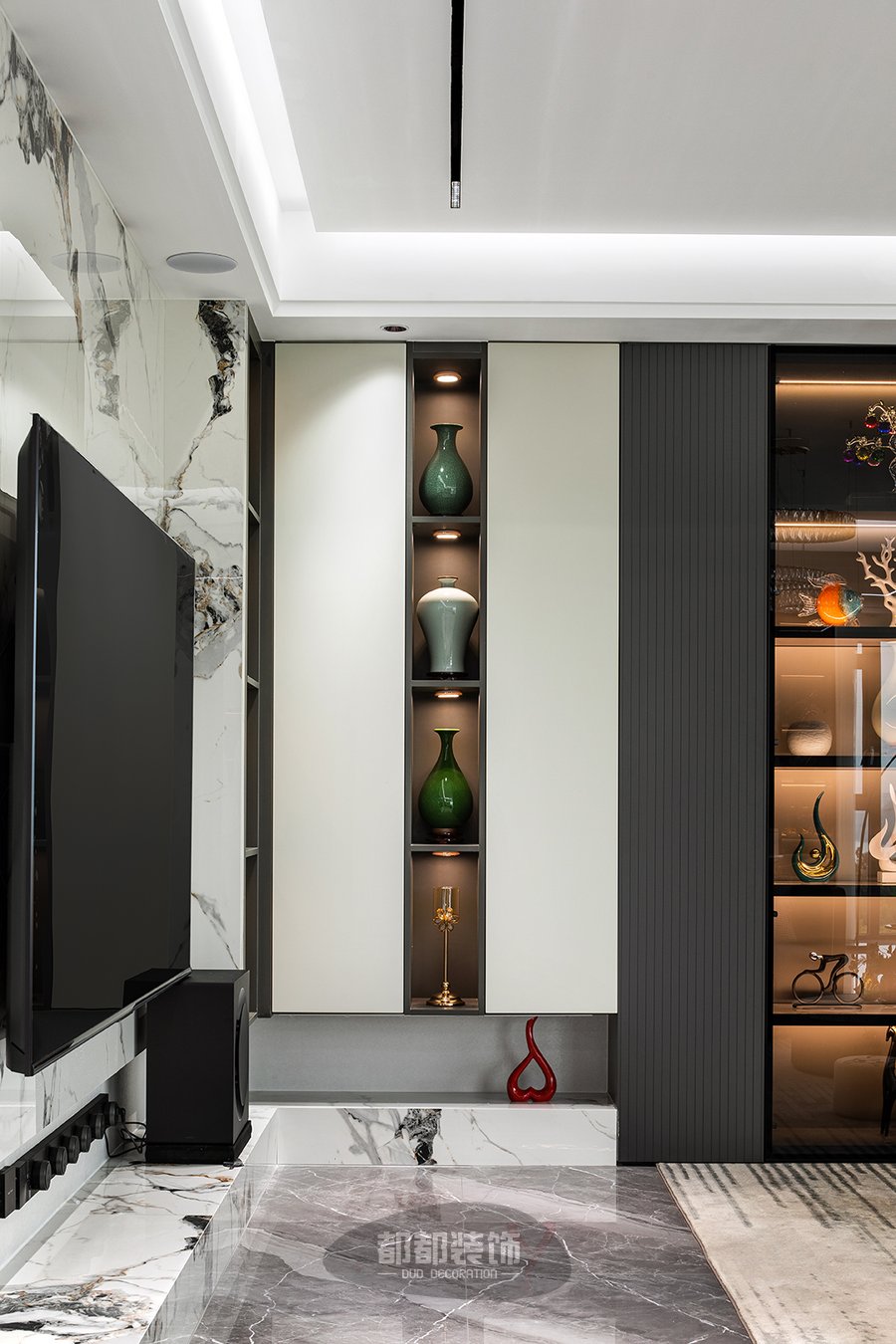 电视背景墙层次丰富,潘多拉大理石自然承接造型柜,对材料和施工有极高要求,让“设计”消失,本身指向于设计的自由度,不受过度繁琐的约束,释放空间的个性和主张;超长轨道插座简约大气,呼应空间理性高级气质,不用再为收纳数据线而烦恼。