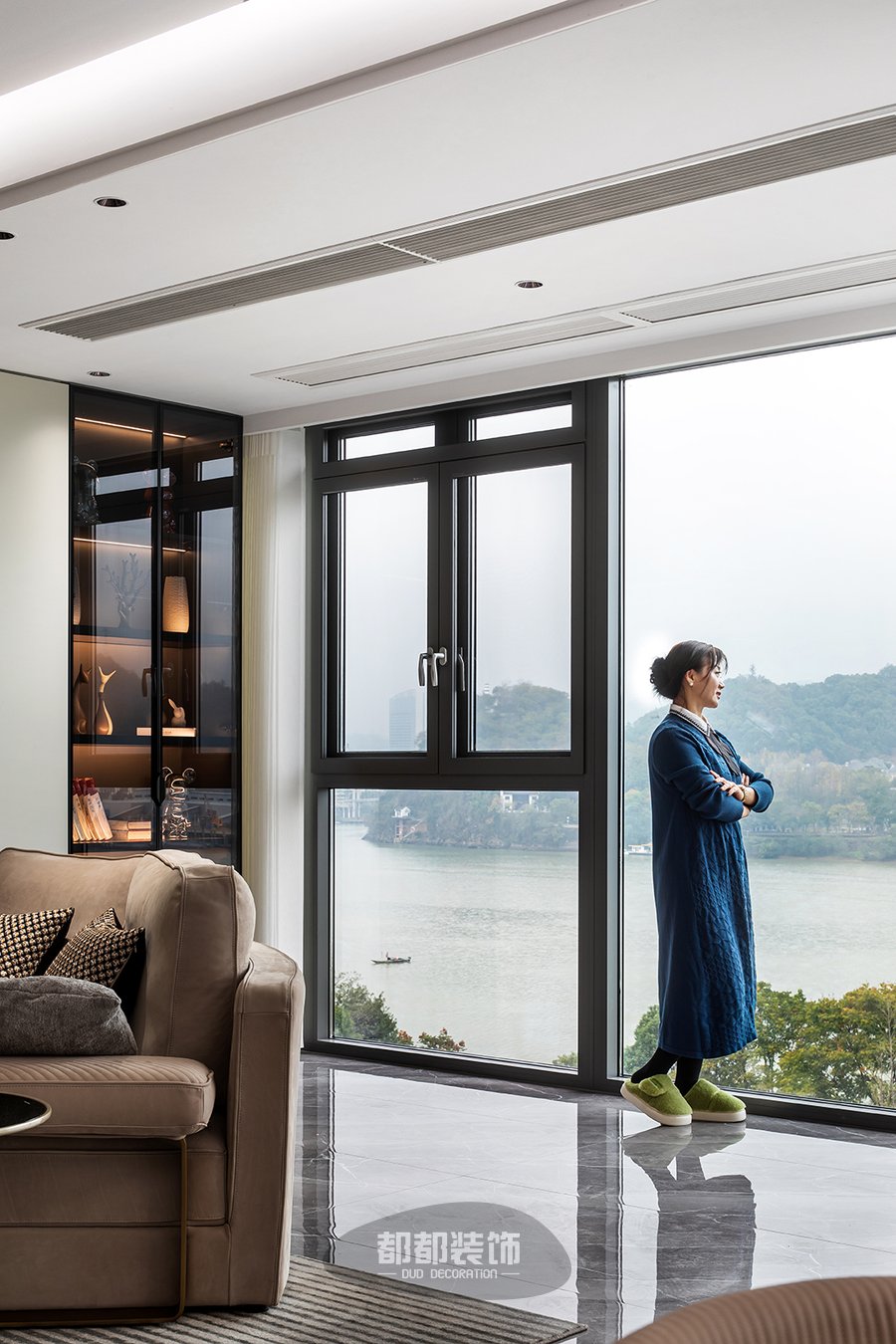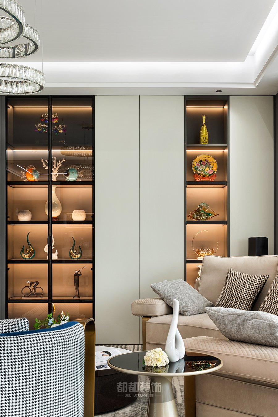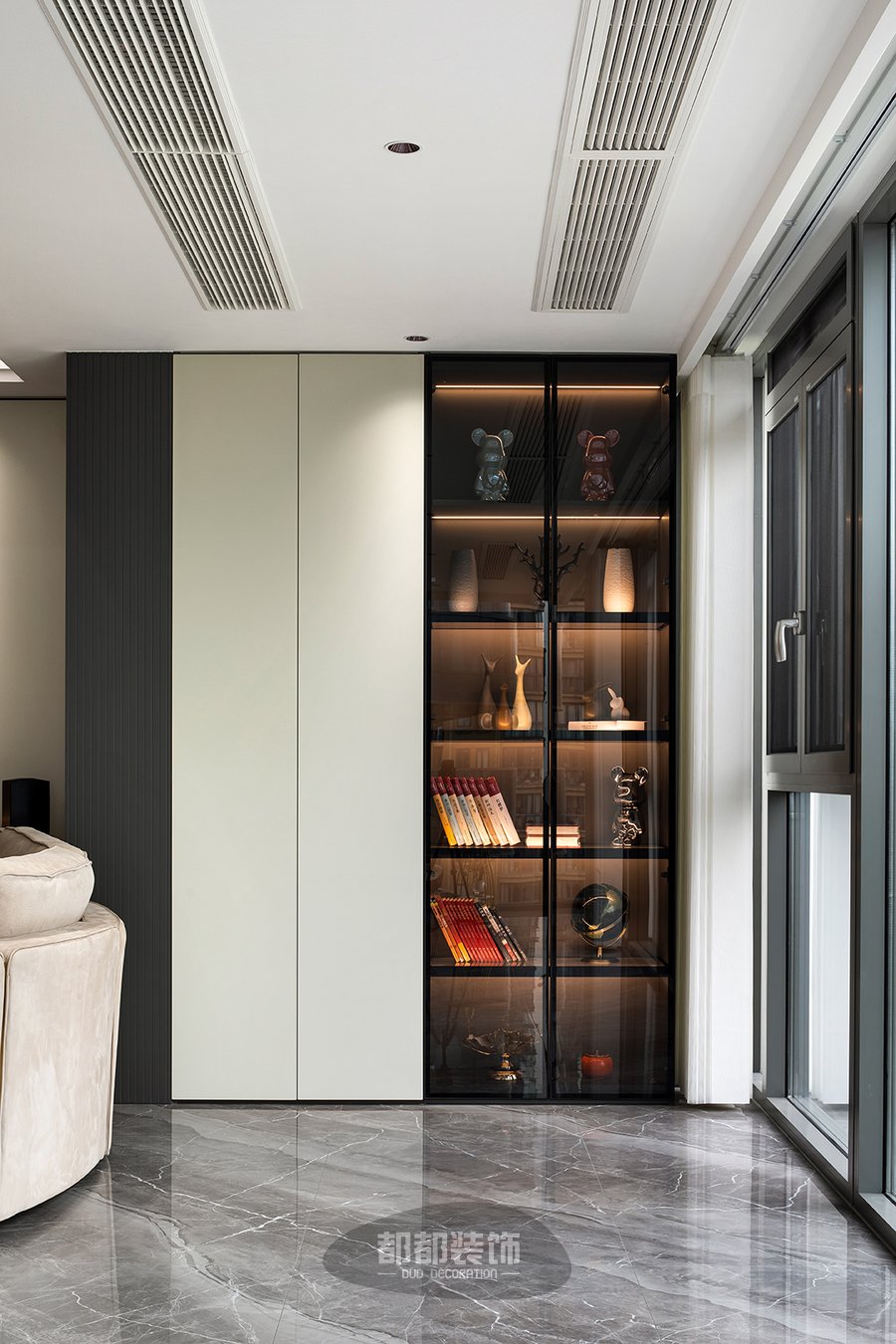 一侧的收纳高柜,结合双排玻璃展示柜,为客厅提供了一套系统性的收纳方案,日常简单打扫就能收获整洁客厅。