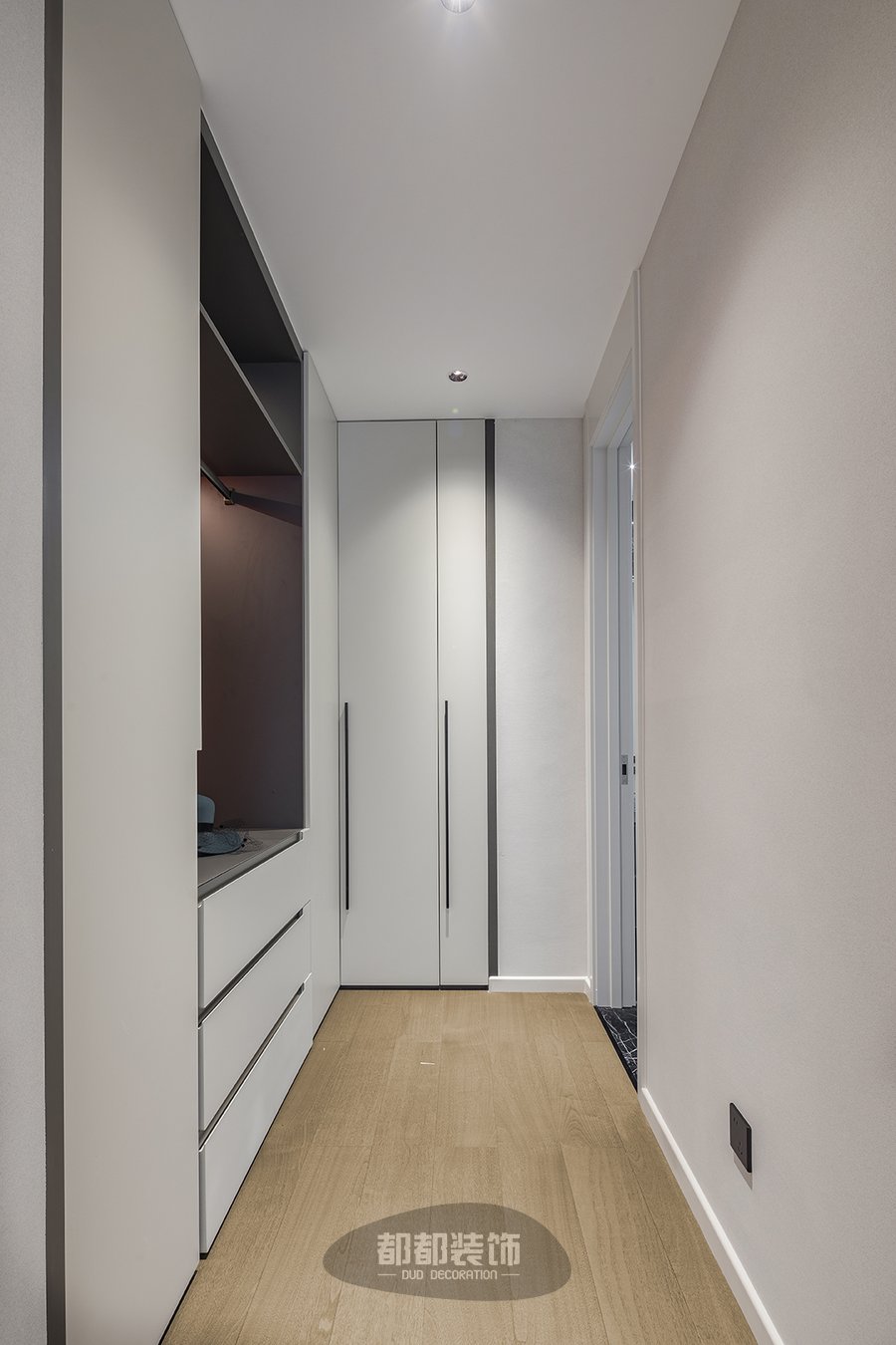 主卧围合出一个独立的衣帽间,收纳专门化,生活更加舒适有格调,柜内灯带保证衣帽间采光的同时,丰富空间视觉感受,衣柜延伸出悬空书桌,平时可以在这里阅读静思。