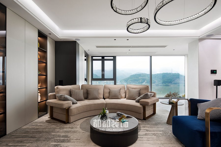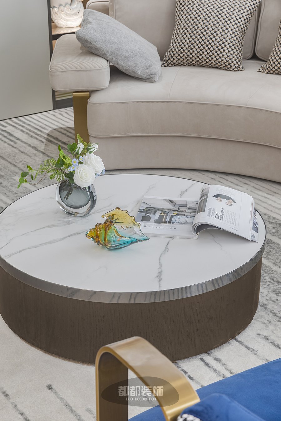 软乎乎的扇形浅咖色沙发,则是居所温馨感的重要体现,搭配线条纹理地毯和室外映入的阳光,高级不失慵懒感,旁边的圆形茶几与沙发完美契合,让人无比的顺手、放松。