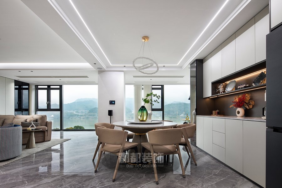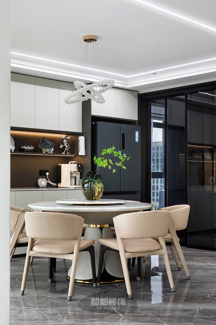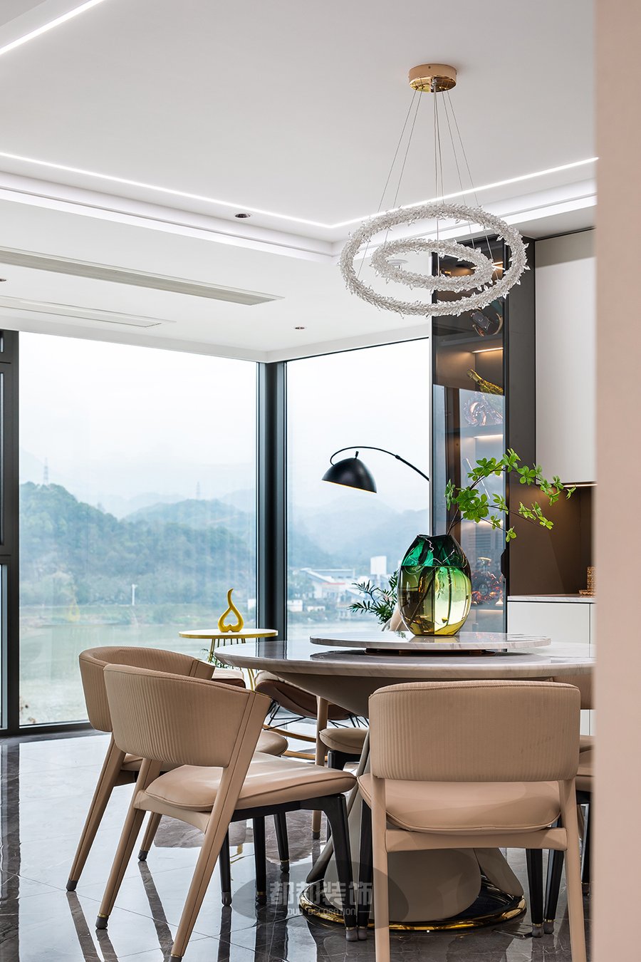 小小的细节,无一不体现出设计师的用心,鱼缸状绿色渐变花瓶、圆环形水晶灯、素雅白餐边柜加上精致的金属餐具,构成了一副完美和谐的画卷。