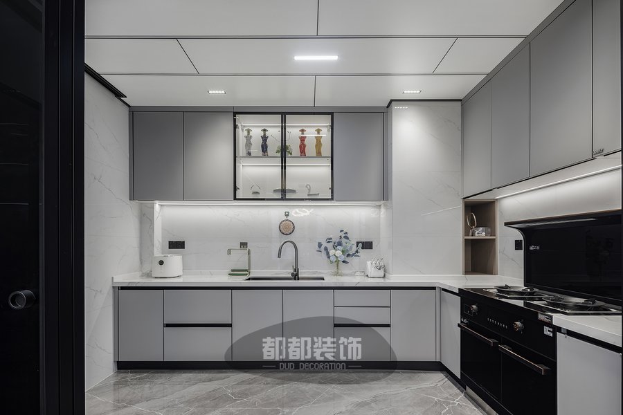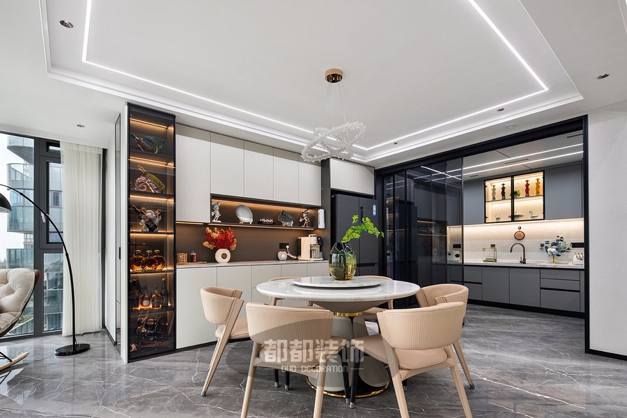 厨房采用玻璃推拉门做封闭式空间,偶尔煎炒烹炸,室内也不会有油烟问题;通透的玻璃材质减弱了厨房没有窗户的压抑感,为烹饪空间引入丰沛自然光线,搭配黑白色橱柜明亮通透,烟火气与时尚感并存,磨砂玻璃吊柜门配合精美的酒品大幅度的提升整体的美观度。