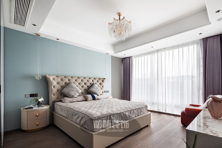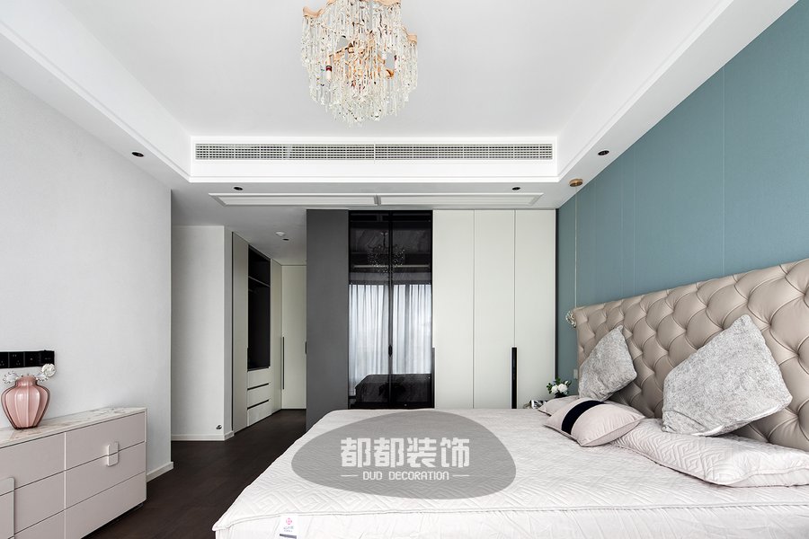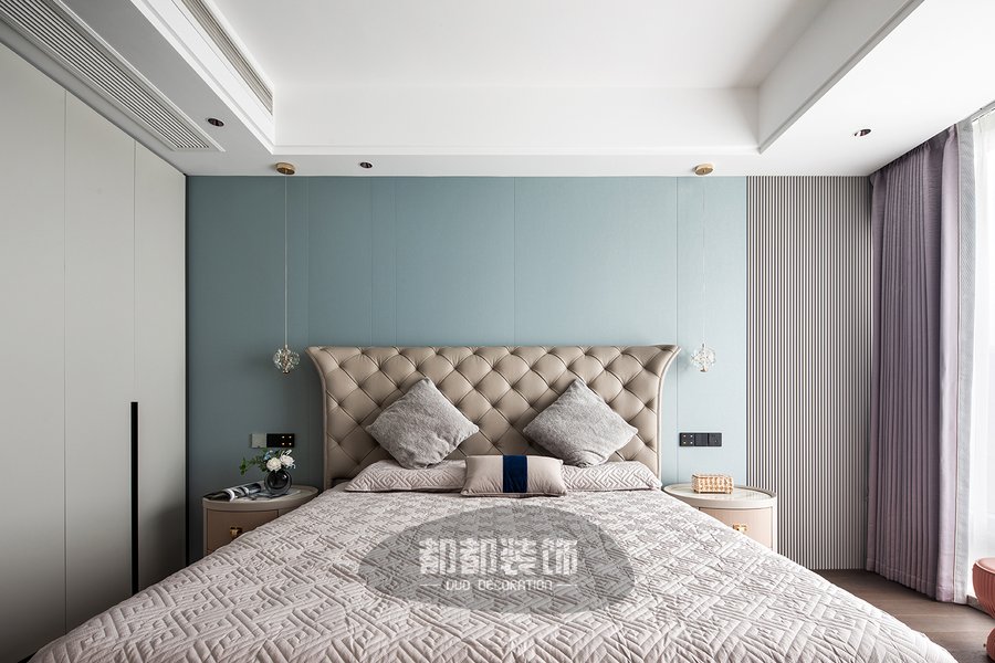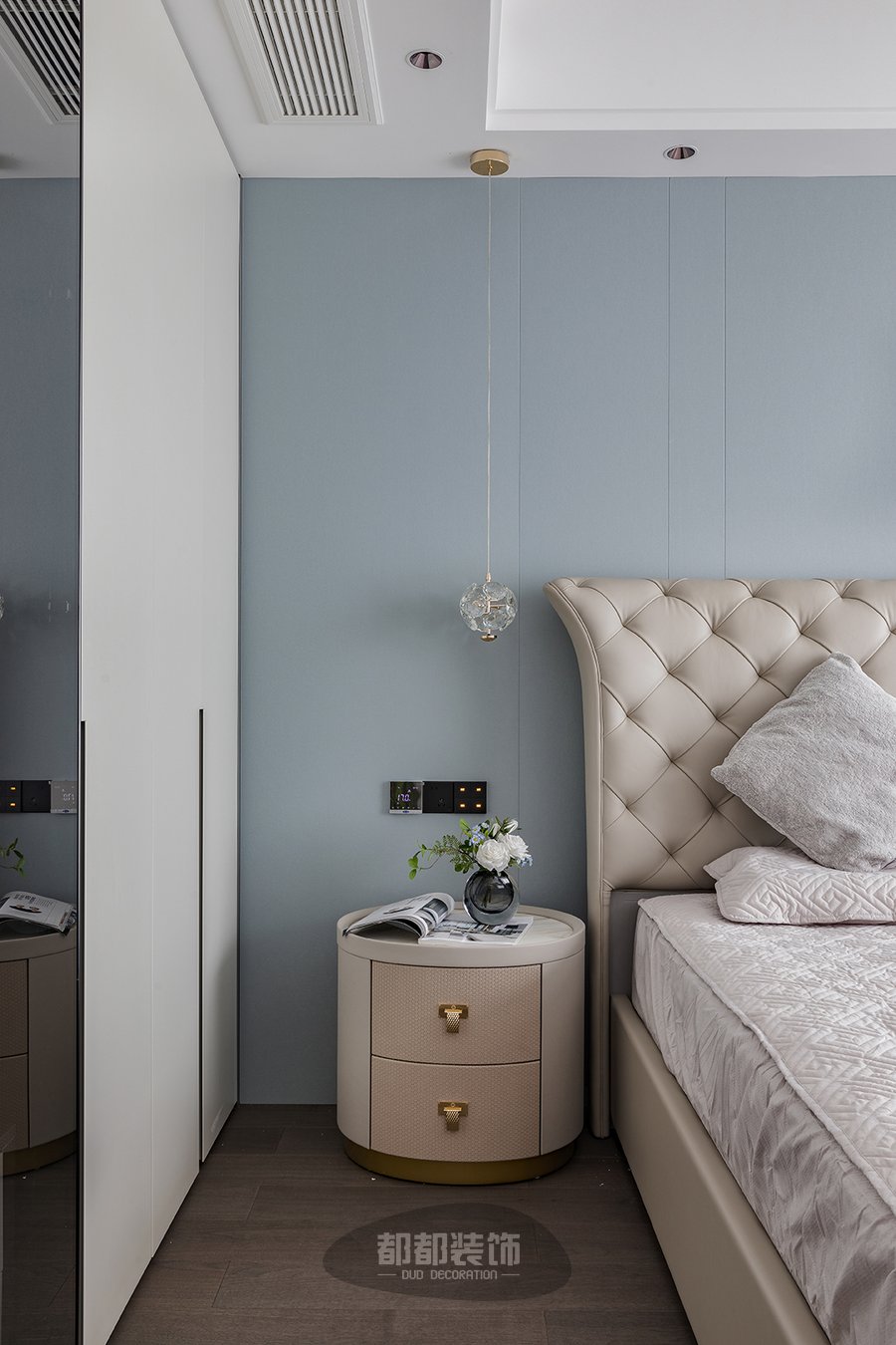 主卧背景墙呼应了公区的天空蓝和格栅元素,居室作为一个整体的特性更加凸显;两侧的水晶暖光小吊灯,为室内带来满满温柔,睡前小读,晚上起夜,兼顾到功能性与审美艺术。