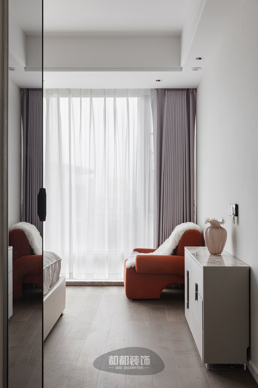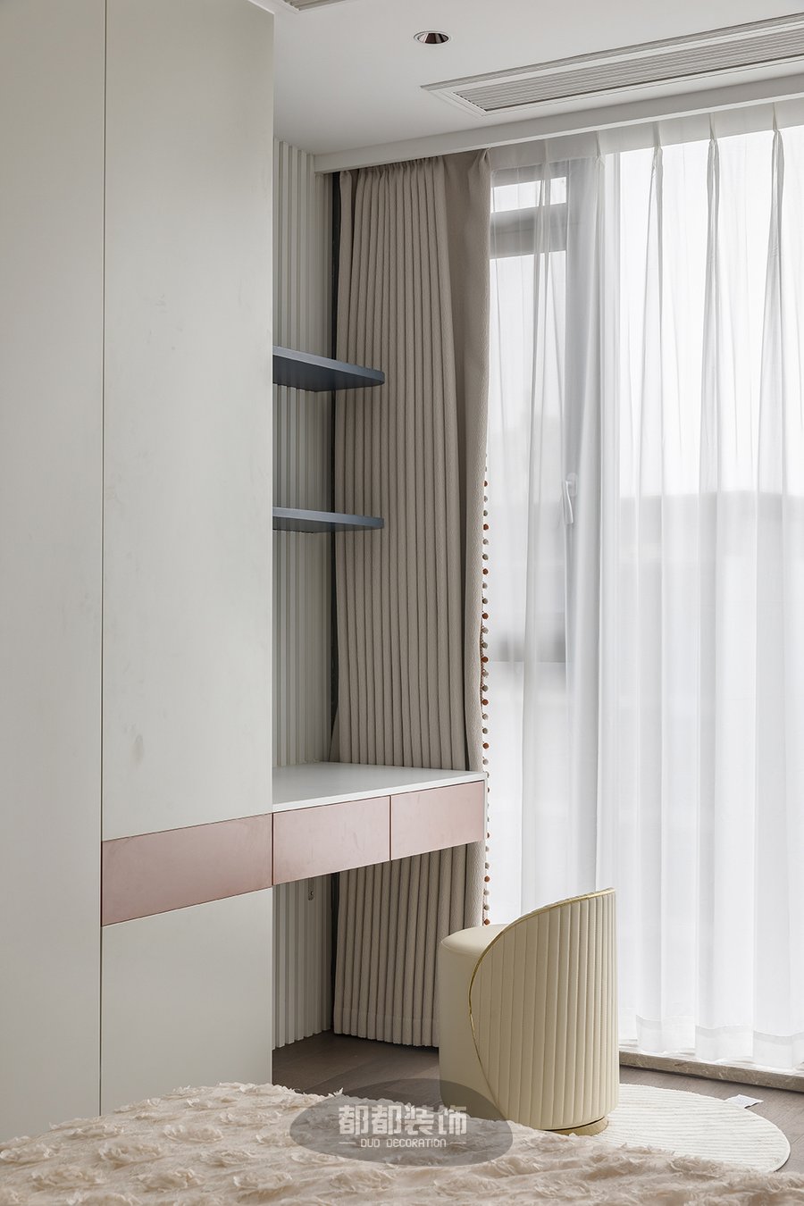 卧室设计强调的是舒展与放松,但同时又充盈着精致的生活态度,吴女士喜爱温柔的米色,于是设计师在床品、床头柜、衣柜的选择上都用上了深浅不一的米白色,双层窗帘,既满足了室内的遮光需求,白天把透光帘展开,过滤入户光线,还在一定程度上保护了居者隐私。