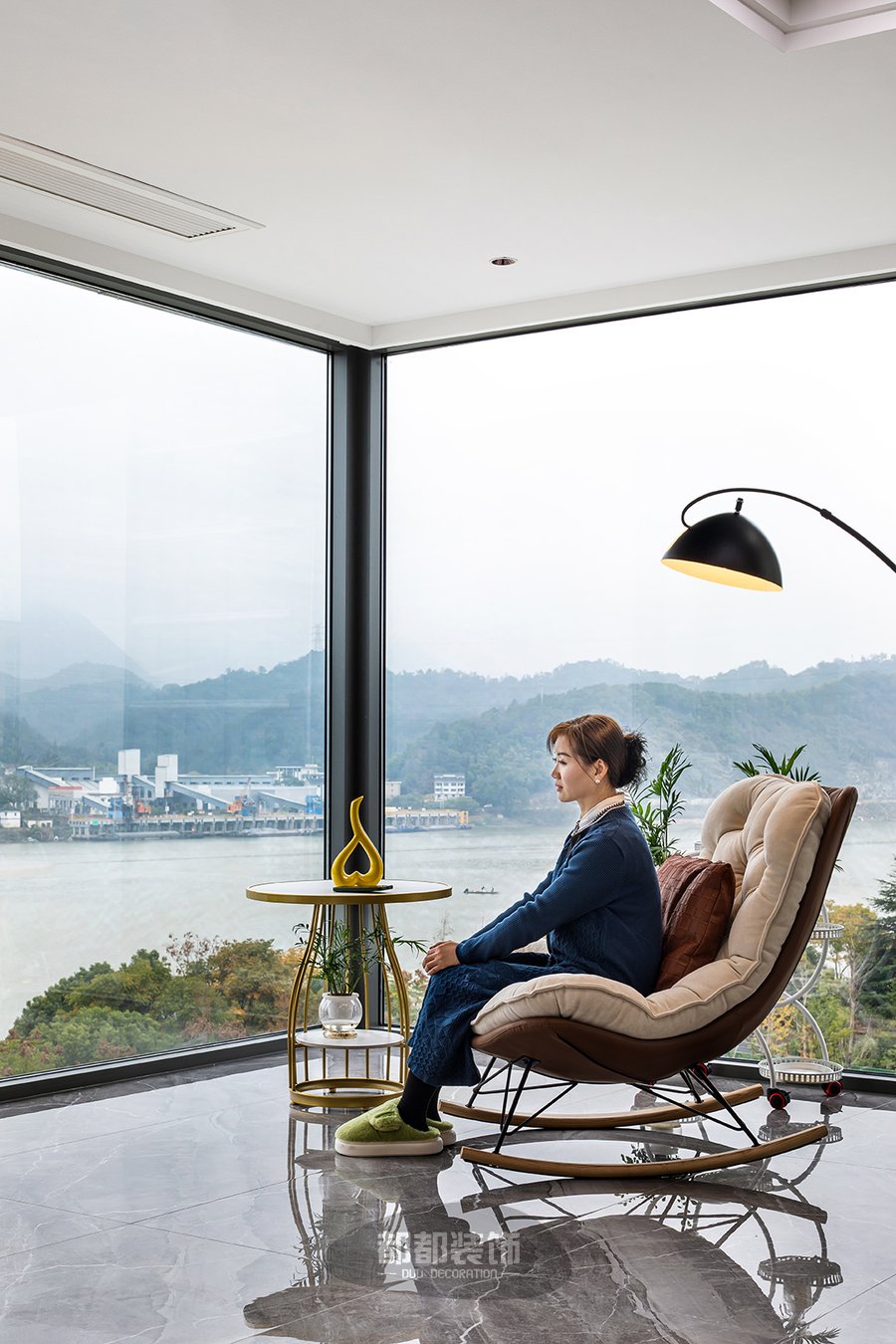吴女士非常享受在落地窗旁闲坐、冥想,美的事物有很多,吴女士却独爱这张弧形懒人沙发,棉麻质感亲肤又舒适,久坐也不变形。